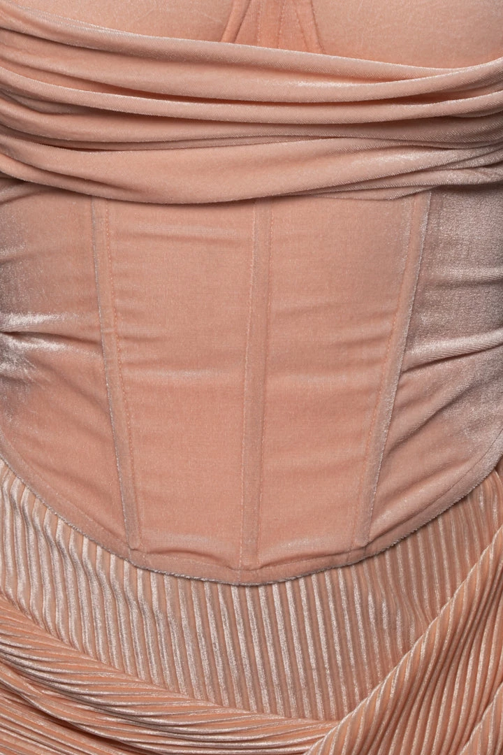 EXCLUSIVELY DESIGNED BY US FOR YOU. Make a statement this season in our BLUSH DREAM MAKER CORSET. Made of a velvet blend, stand out in this charming corset style top featuring a strapless neckline with a draped design and padded cups for support. The bodice is structured with boning detail throughout and is cropped with a curved hem. Complete with a back zipper for closure and silicone grip at the bust for a secure hold. Pair with our TRUE BLISS MAXI SKIRT for the full look. Stretchy. Fully lined.
