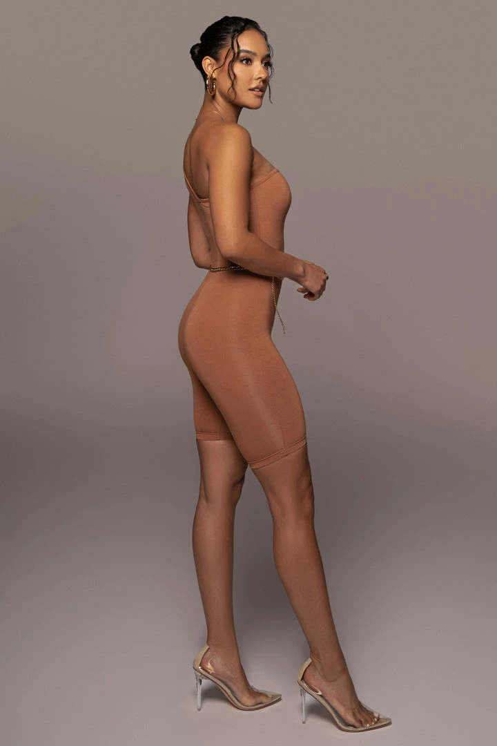 EXCLUSIVELY DESIGNED BY US FOR YOU. Upgrade your everyday looks with our BODYBASIX PECAN DOROTHY ONE SHOULDER ROMPER. This single line romper features a one-shoulder neckline with curve hugging silhouette and a seamless design. Crafted in our highly loved Bodybasix fabric, this piece offers compression support with amazing hold. Stretchy.