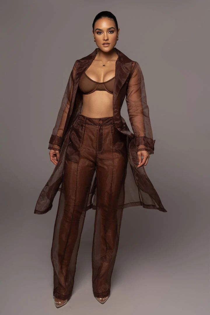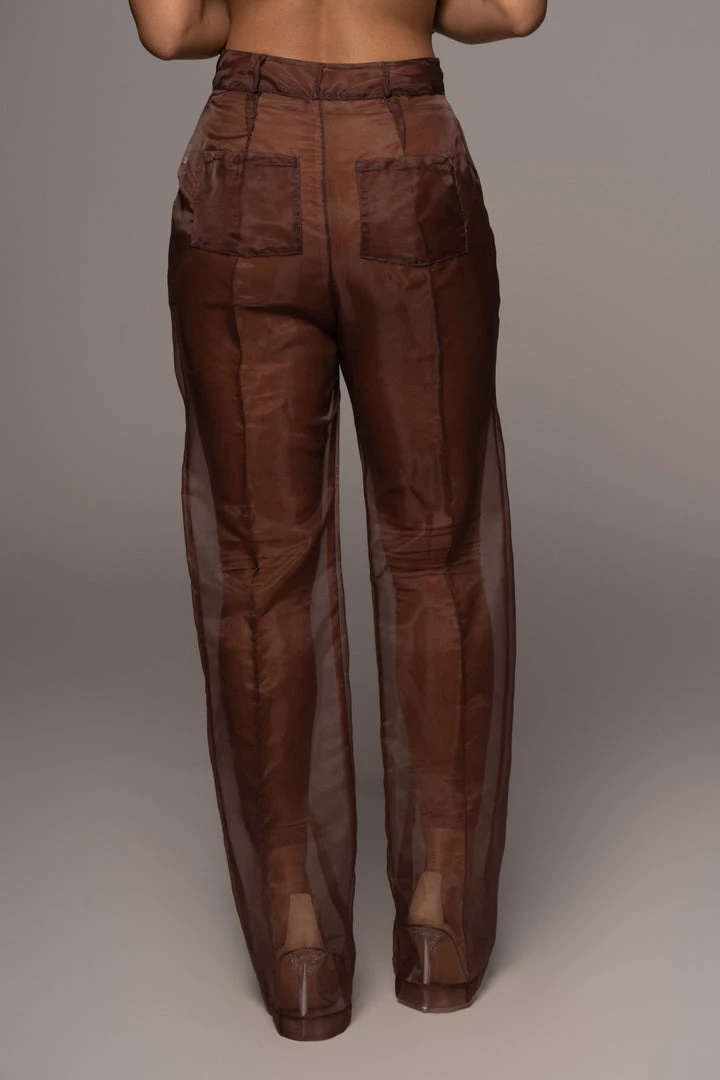 EXCLUSIVELY DESIGNED BY US FOR YOU. Achieve a look that’s iconic in our new CHOCOLATE LIVY ORGANZA PANTS. Designed in a see through organza fabric, this pair of wide leg trousers come with a front button/zipper closure, two functional side pockets, two back welt pockets, and vertical line detailing down the center front/back to finish the look. Pair with the JEANNA COAT and JONI BRALETTE for the full look. No stretch.