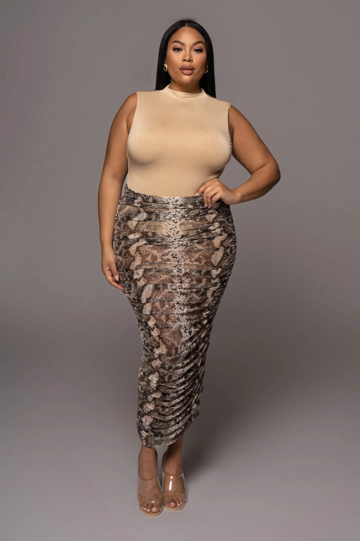 EXCLUSIVELY DESIGNED BY US FOR YOU! Live on the wild side all summer long. Stretchy, lightweight, ruched midi skirt features sheer mesh throughout, a solid waistband, and no closures. Perfect to pair with your swim or for a bold and sexy look pair with a bodysuit!