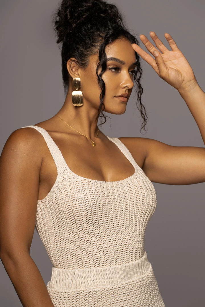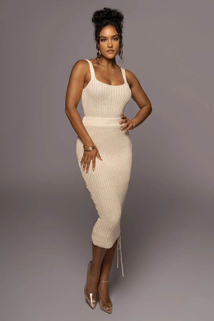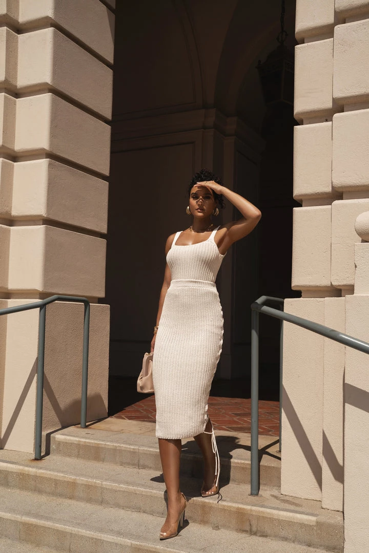 EXCLUSIVELY DESIGNED BY US FOR YOU. Crochets & lace-ups! Our two favorite things come together in the new IVORY BARE IT ALL SKIRT SET. This lovely sweater knit set features a top with tank shoulder straps and trendy back lace up detail. The matching skirt to this summer ready set comes with an elastic waistband and stylish lace up ties on one side. Stretchy. Sold as set.