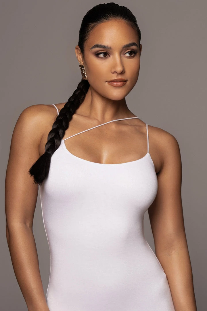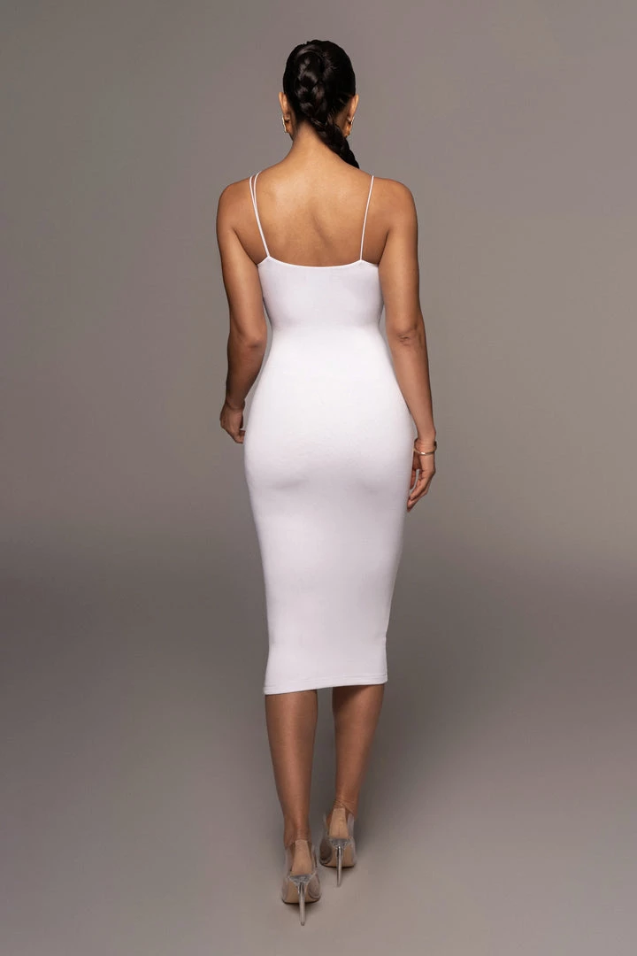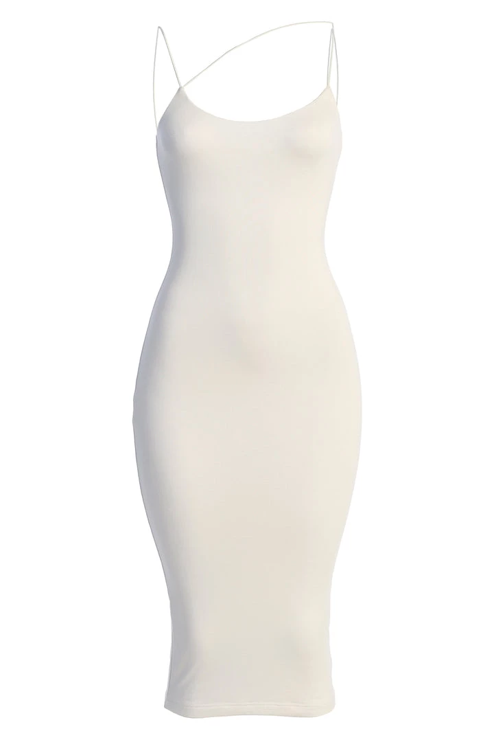EXCLUSIVELY DESIGNED BY US FOR YOU. If you loved the Valencia dress, you’ll be completely smitten by our JLUXBASIX IVORY RORY DIAGONAL STRAP DRESS! Designed in our double lined material, this bodycon midi dress showcases a scoop neckline with thin bungee shoulder straps and a stylish diagonal bungee strap across the chest for a luxe touch. Super soft with stretch. Double lined.