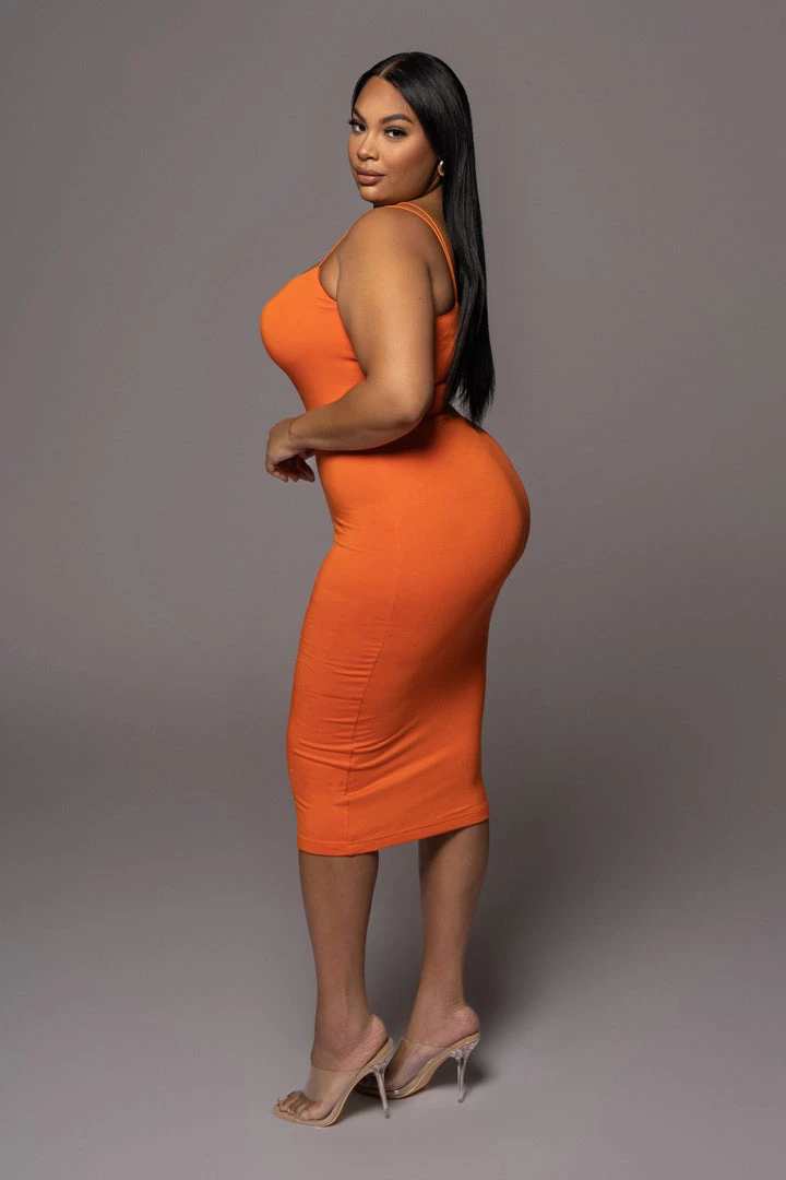 EXCLUSIVELY DESIGNED BY US FOR YOU. If you loved the Valencia dress, you’ll be completely smitten by our JLUXBASIX TANGERINE RORY DIAGONAL STRAP DRESS! Designed in our double lined material, this bodycon midi dress showcases a scoop neckline with thin bungee shoulder straps and a stylish diagonal bungee strap across the chest for a luxe touch. Super soft with stretch. Double lined.
