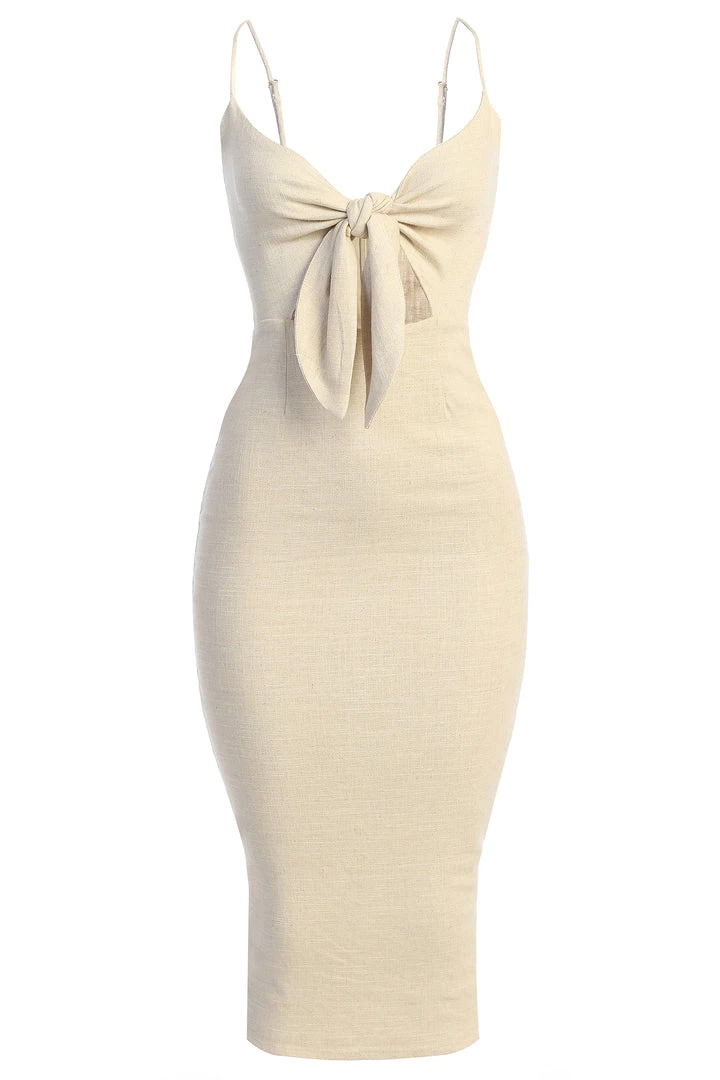 EXCLUSIVELY DESIGNED BY US FOR YOU. The NATURAL DOLORES LINEN DRESS has become our newest obsession. This lovely midi dress features a tie-front design with a flirty keyhole, adjustable shoulder straps, and a lower back center slit. Complete with back zipper closure and interior lining for comfort. Slight Stretch.