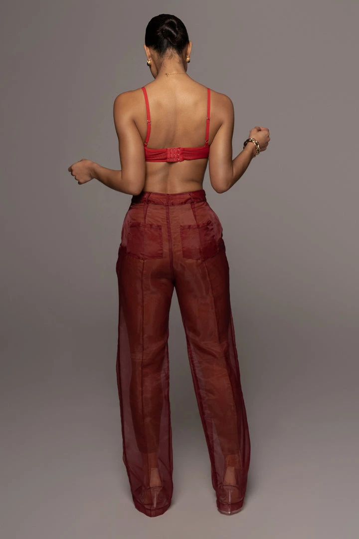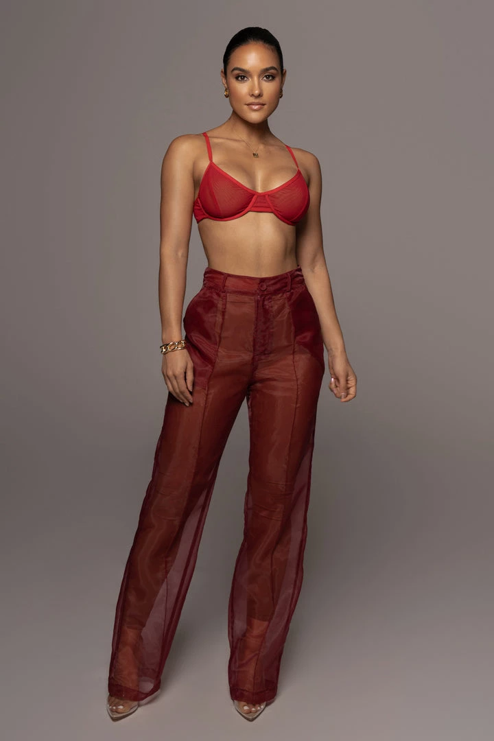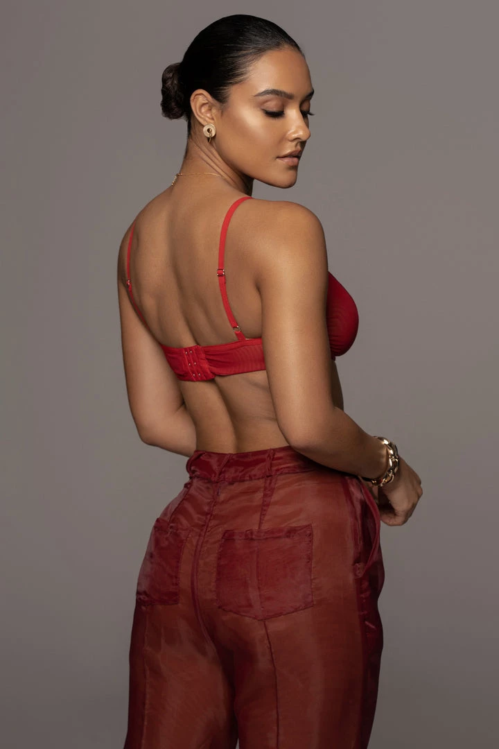 EXCLUSIVELY DESIGNED BY US FOR YOU. Our RED JONI BRALETTE is endlessly versatile! This flirty bralette comes with underwired cups for support, adjustable shoulder straps, and adjustable triple back hook and eye closure. Designed in a mesmerizing sheer mesh fabric, this staple piece takes any look to a polished level. Pair with the LIVY ORGANZA PANTS for the full look. Interior lining for some coverage.
