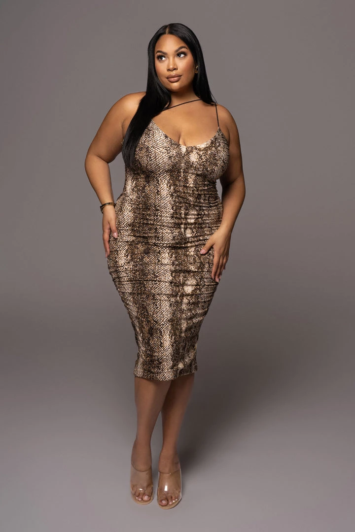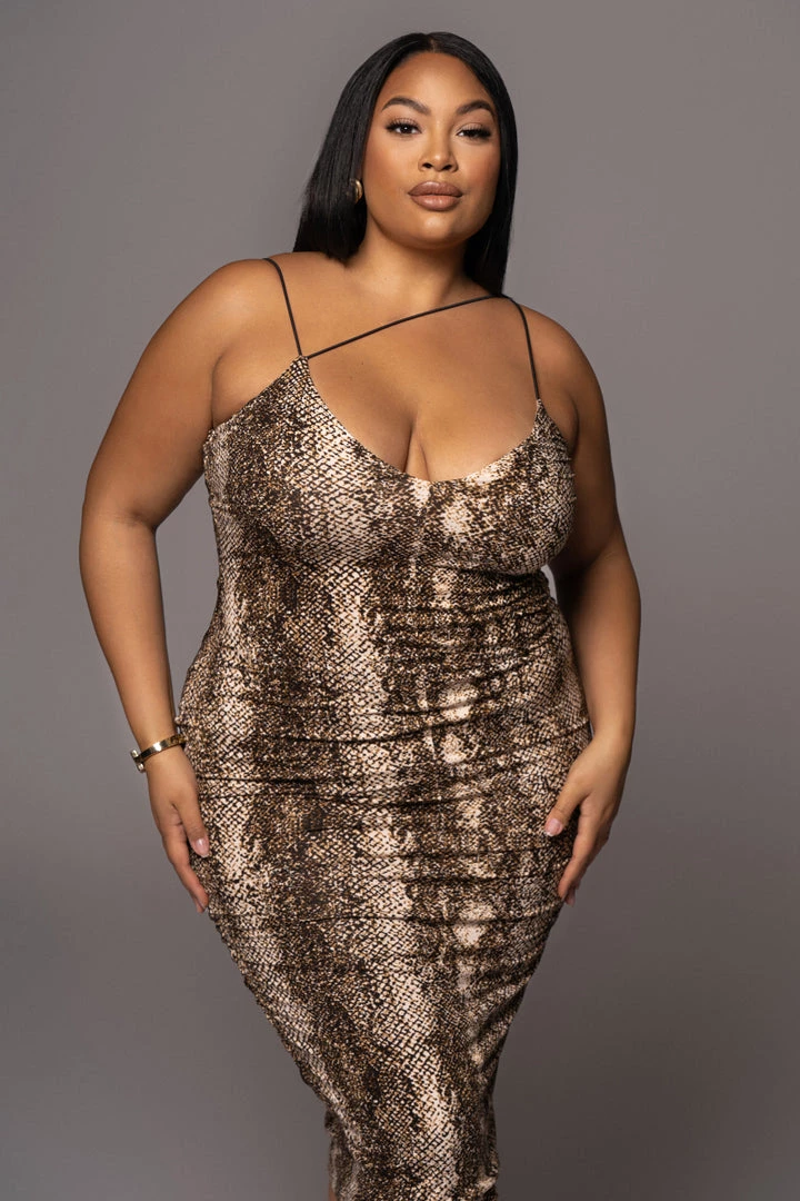 EXCLUSIVELY DESIGNED BY US FOR YOU. Bringing you our most loved design, the Valencia Dress, in all new prints! Our SNAKESKIN SYLVIA DIAGONAL STRAP DRESS is designed in a fierce snakeskin print and highlights a low neckline with bungee shoulder straps and an edgy diagonal strap across the chest to finish the look. Designed in a smooth double line fabric, this sleek midi dress is one you can’t live without! Stretchy.
