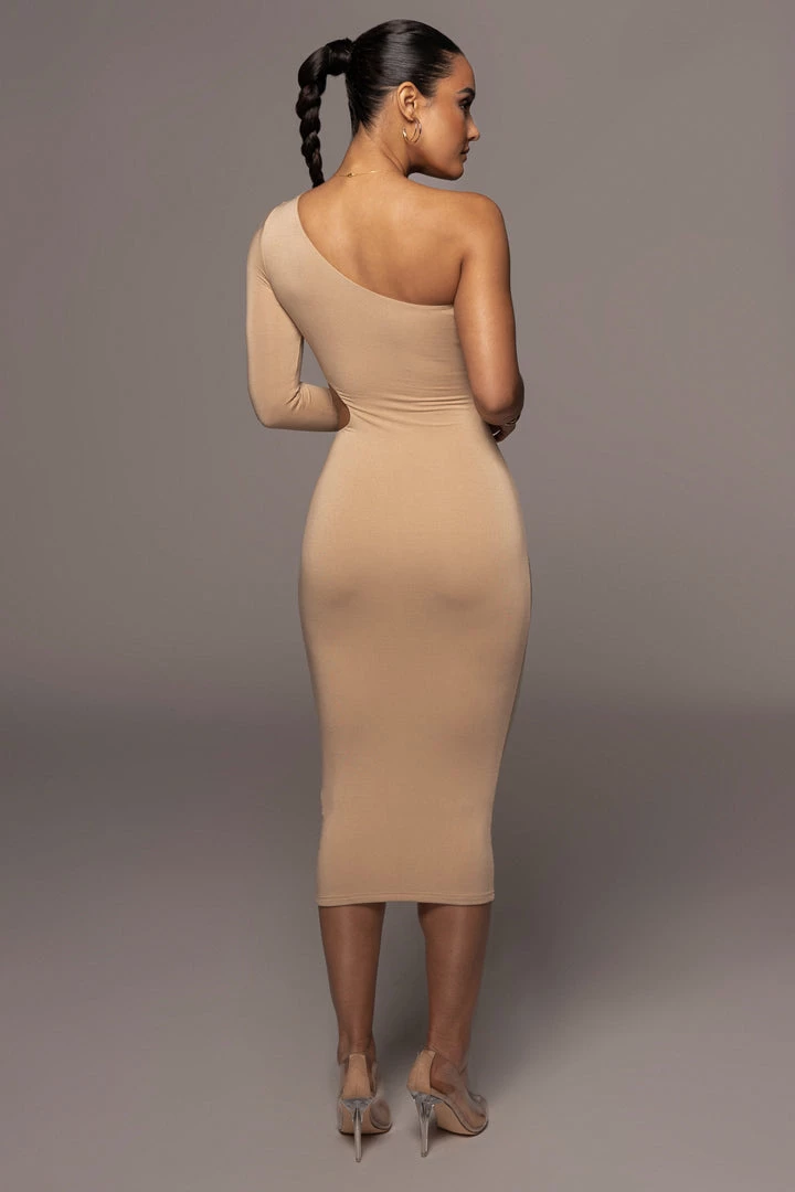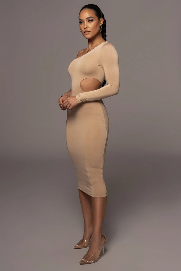 EXCLUSIVELY DESIGNED BY US FOR YOU. You’ve never met another like our TAN JULIA MIDI DRESS! Designed in our smooth double lined fabric, this stylish bodycon dress is perfect for a night out on the town! Featuring a low scoop neck with one sleeve neckline and an alluring side cutout at the waist. Stretchy. Midi hem.