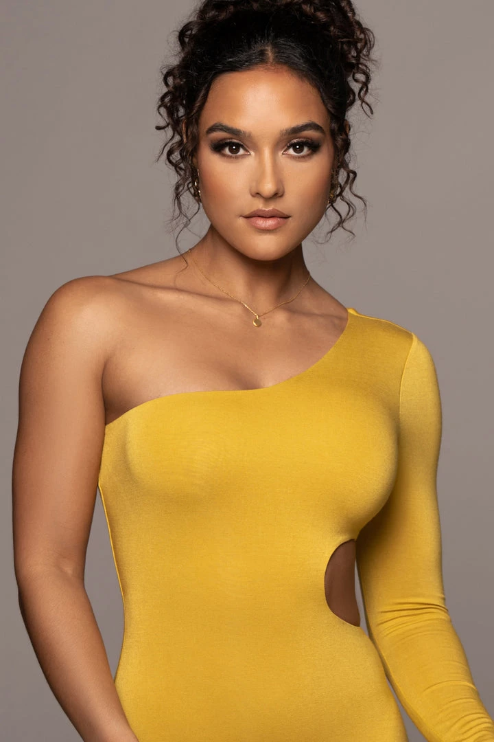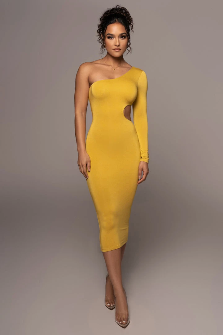 EXCLUSIVELY DESIGNED BY US FOR YOU. You’ve never met another like our YELLOW JULIA MIDI DRESS! Crafted in a double lined jersey fabric, this stylish bodycon dress is perfect for a night out on the town! Featuring a low scoop neck with one sleeve neckline and an alluring side cutout at the waist. Stretchy. Midi hem.