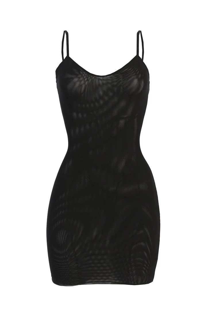 EXCLUSIVELY DESIGNED FOR YOU BY JLUXLABEL. Slay today and every day after in our NOIR MESH LAYERING MINI DRESS UNDERGARMENT! This stunning undergarment dress features a v-neckline with adjustable cami straps, and a bodycon silhouette ending in a raw cut mini hem. Designed in a sheer mesh double lined fabric for compression and flexibility. Layer under clothing for a smooth and sleek finish any day! Stretchy.