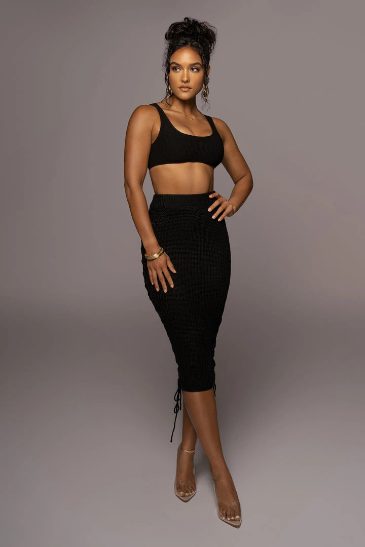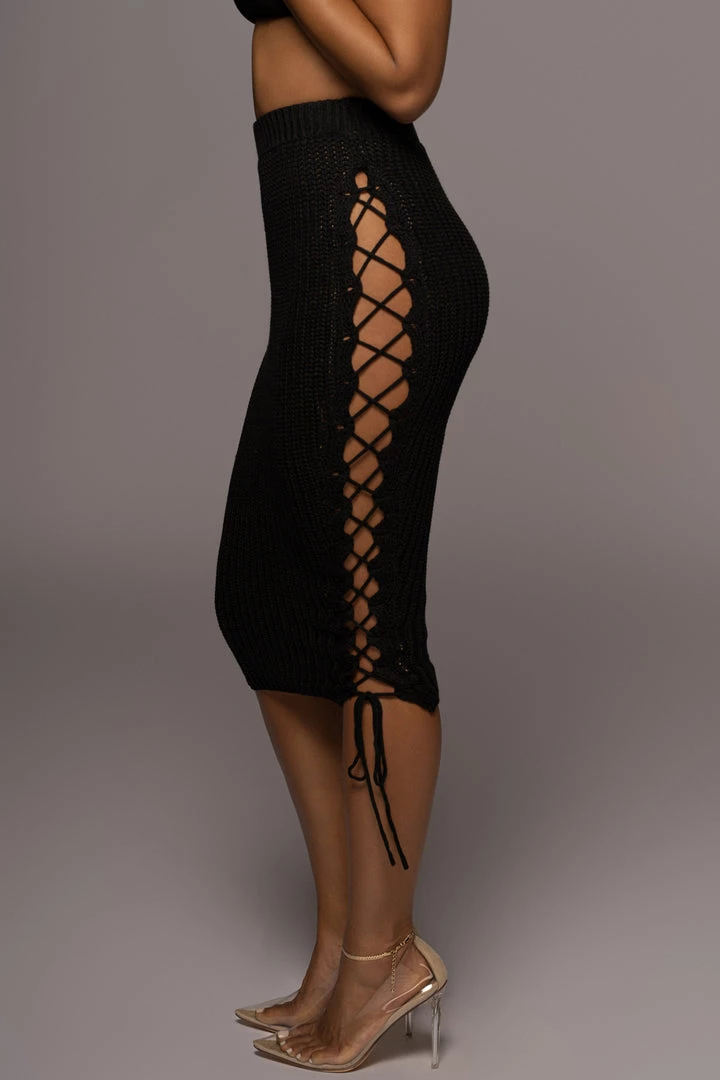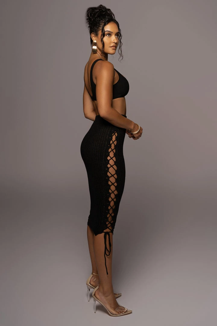 EXCLUSIVELY DESIGNED BY US FOR YOU. Get to and from the beach in versatile fashion with our NOIR SECOND CHANCES SKIRT. Crafted in a soft sweater knit fabric, this crochet skirt comes with an elastic waistband and lace up ties on both sides starting at the top hem down to the bottom hem. Style as a swim cover-up or pair with your fave top, the choice is yours. Pair with our BLESSE RIBBED BIKINI SET for the full look. Stretchy.
