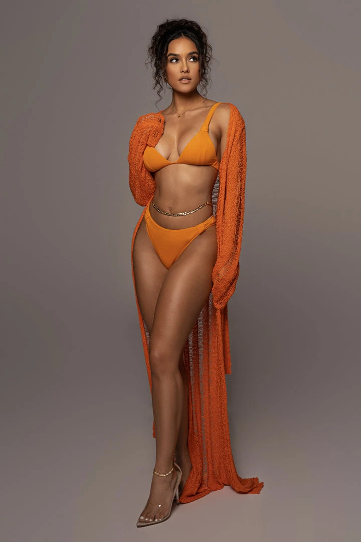 EXCLUSIVELY DESIGNED BY US FOR YOU. Chase the sun all season long in our ORANGE YUBA PERFECT CUT BIKINI! This two piece swim set is constructed of stretchy ribbed fabric and features a triangle cut bikini top with adjustable straps and a back clasp closure. Cheekini bottoms offer the perfect amount of coverage while complimenting all your natural curves! Moveable loops accent both the top and bottoms for a finishing touch. Pair with our SIGHTS TO SEE CARDIGAN for the full look. Double lined. Unpadded. Sold as set.