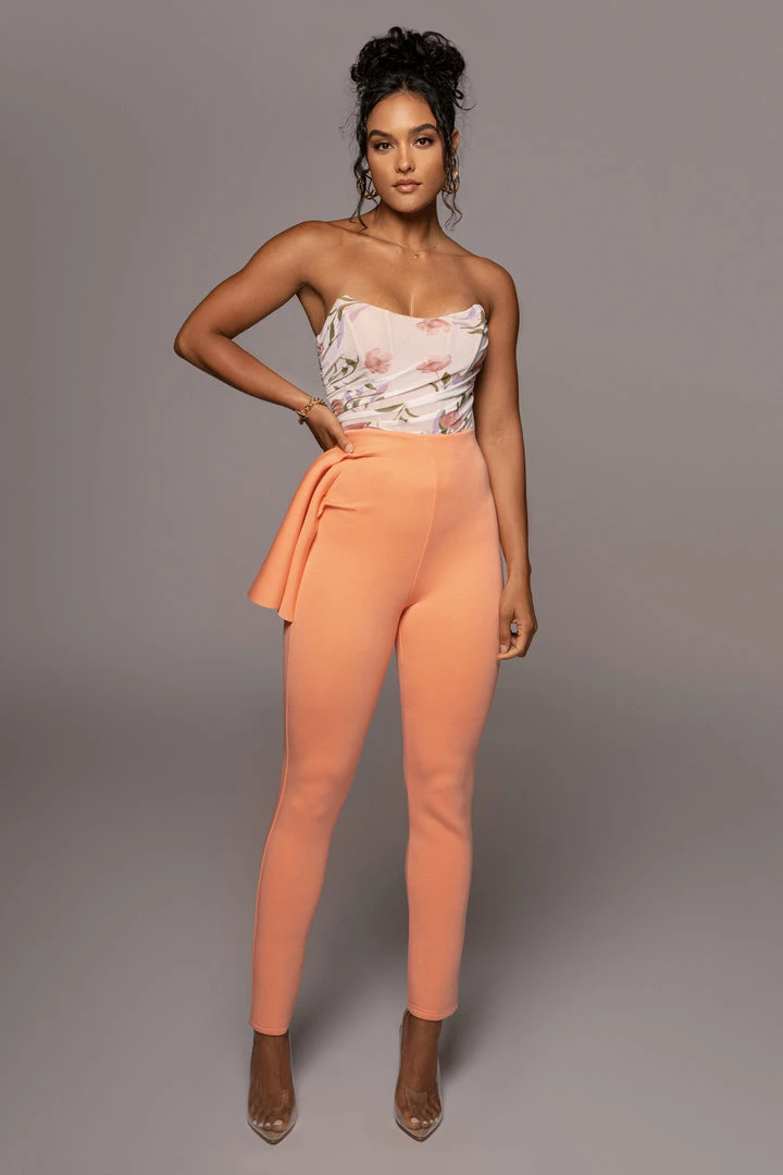 EXCLUSIVELY DESIGNED BY US FOR YOU. Our PEACH ABRIL HIGH WAIST PANTS feature a classic silhouette with a contemporary twist! Classy high waist pants detailing a mini drape on one side with fitted leg hems and a hidden side zipper closure. Crafted in a thick, ultra soft fabric for quality and comfort. Pair with our FULL BLOOM CORSET for the full look. Stretchy.