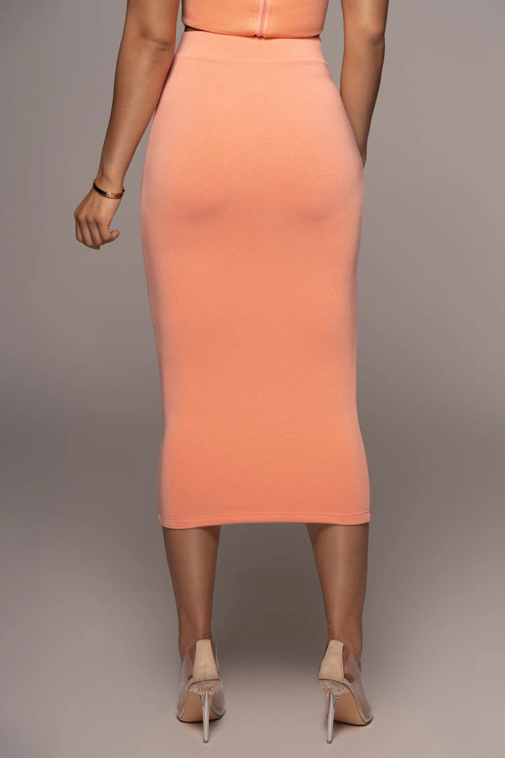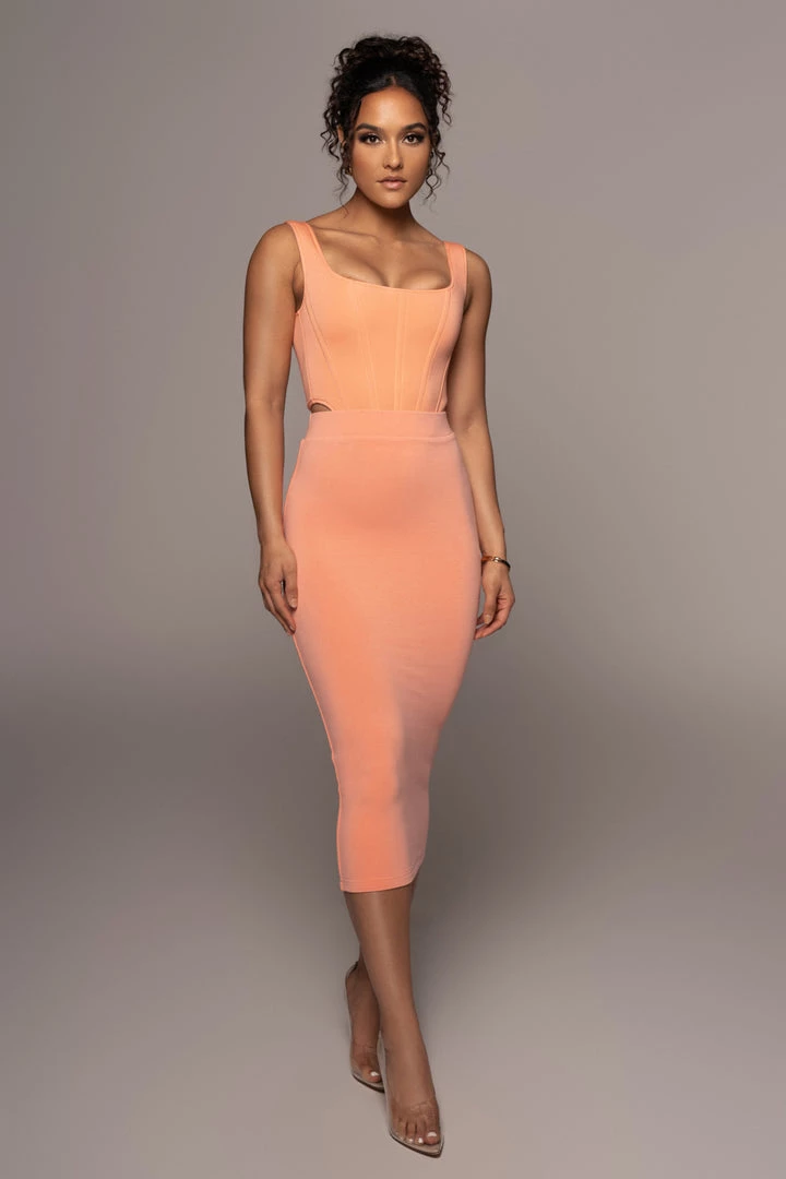 EXCLUSIVELY DESIGNED BY US FOR YOU. You’ll be immediately drawn to our PEACH LEILAH MIDI SKIRT. Designed with comfort in mind, this timeless pencil style skirt can be worn in so many ways. Topped with an elastic waistband for a cinched waist and minimal seams for a smooth finish. Pair with our LET’S GET LOST CORSET for the full look. Double lined. Stretchy.