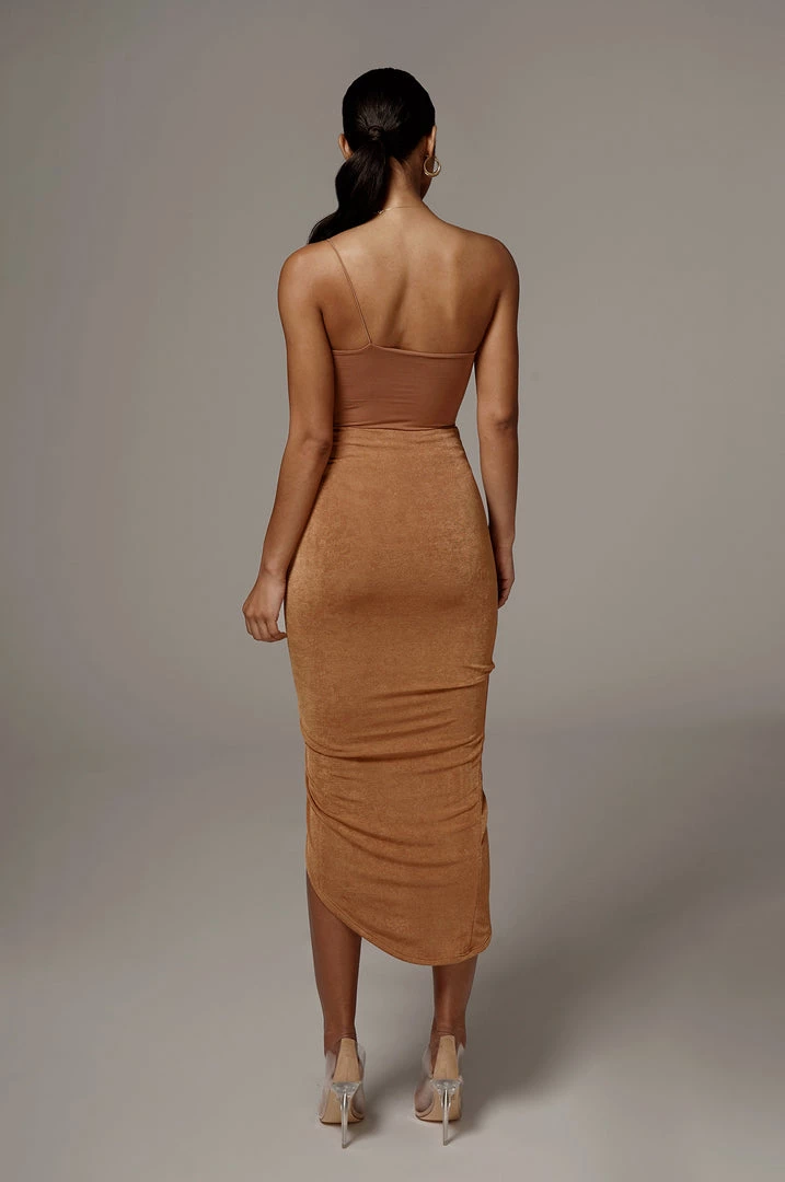 EXCLUSIVELY DESIGNED BY US FOR YOU. Our PECAN AURA SLINKY SKIRT is meant for memorable nights out! Beautifully designed in our signature double lined slinky material, this skirt is detailed with an alluring ruched design and an adjustable drawstring side slit for your desired length. Pair with our Kenzia High Neck Bodysuit and complete the look! Stretchy. Double lined.
