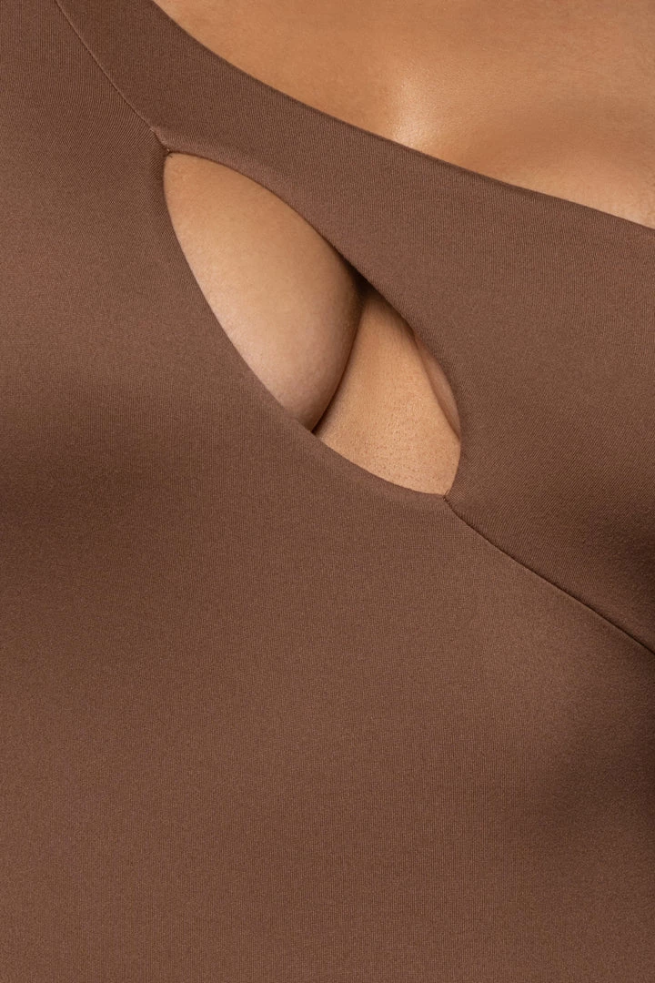 EXCLUSIVELY DESIGNED BY US FOR YOU. Our PECAN DARLA KEYHOLE BODYSUIT is a soft one shoulder bodysuit that showcases a bold keyhole at the front with a fitted long sleeve. Designed in our double line jersey fabric for compression support achieving a flattering silhouette. Complete with a thong bottom and snap button closure. Stretchy.