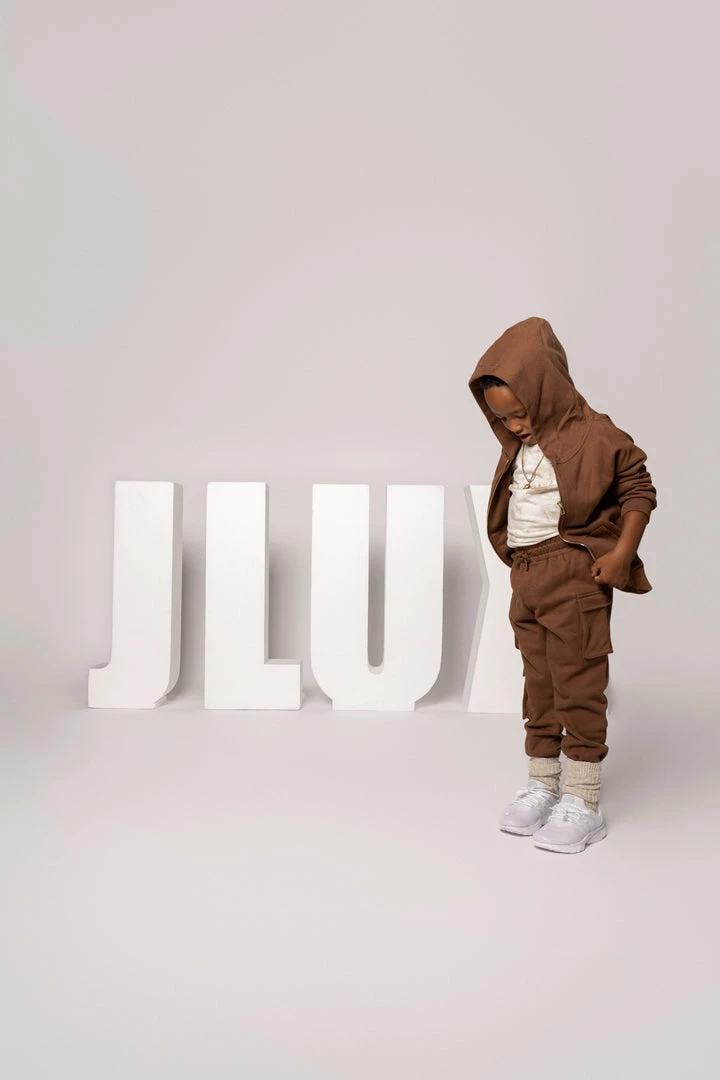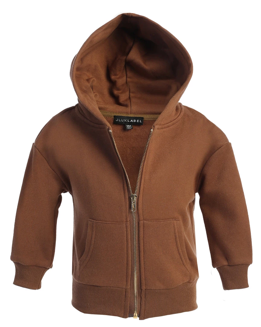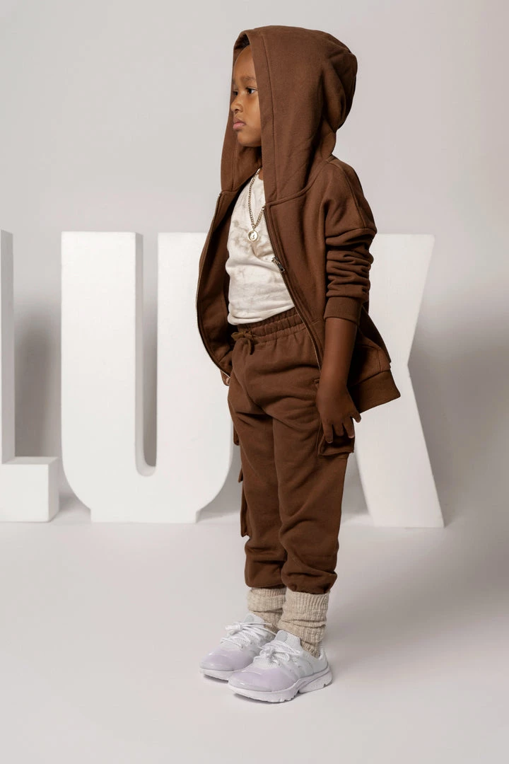 EXCLUSIVELY DESIGNED BY US FOR YOU. Have the little ones matched to perfection in our limited edition PECAN JLUXKIDS FLEECE UNISEX HOODIE! This miniature zip-up sweatshirt is the only clothing your child will want to live in this season! Cut in a stylish oversized fit, featuring a hooded neck with drawstrings, front zip-up closure, a split kangaroo pocket, and ribbed bands at the cuffs and hem. Pair with our JLUXKIDS UNISEX CARGO JOGGERS for a look that complements your child’s style! Stretchy. Gold tone hardware.