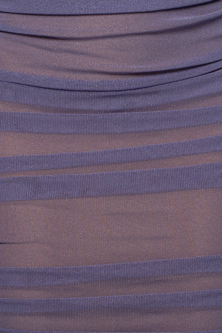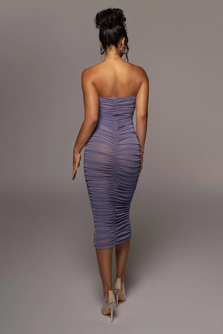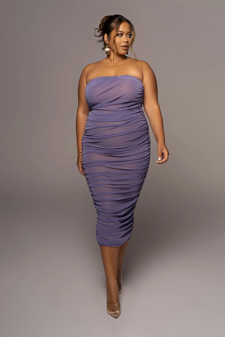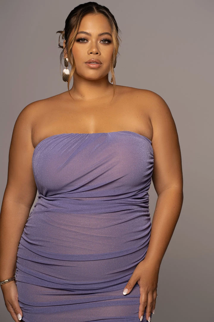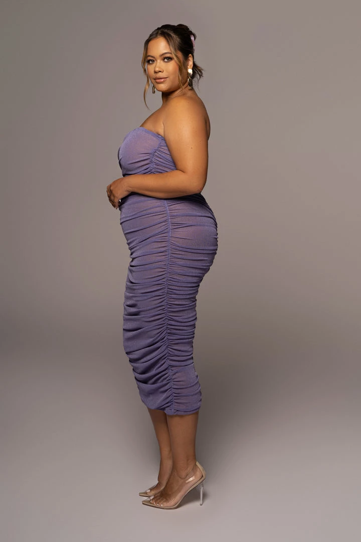 EXCLUSIVELY DESIGNED BY US FOR YOU. Head to toe glamour in the PURPLE/SILVER CELESTIA MIDI DRESS. Prepare to turn heads in this shimmery design featuring a strapless neckline and ruching throughout with a figure hugging silhouette that accentuates your waistline. Complete with lined interior and grip silicone gel at the bust for a secure hold. Midi length hem. Stretchy.