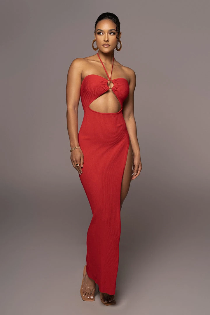 Show off some skin in our new RED JULIETA MAXI DRESS. This irresistible maxi dress features a front o-ring detail with cutout, adjustable neck tie closure, and a captivating high slit on one side to finish the alluring design. Made of a thick rib knit material for perfect quality and comfort. Stretchy. Single lined.