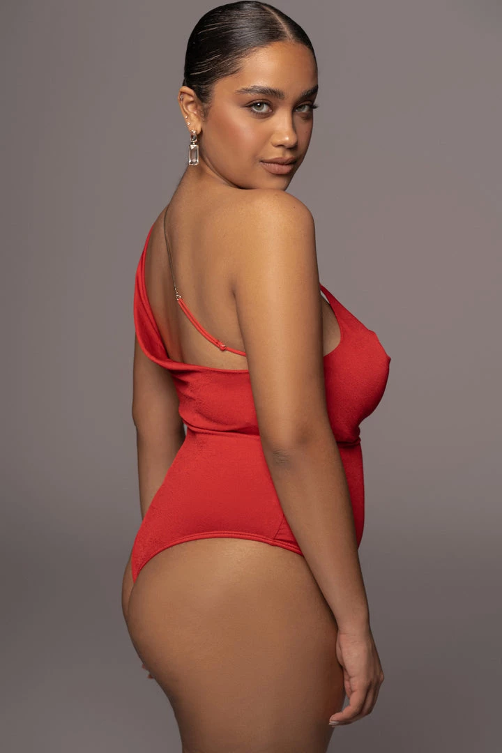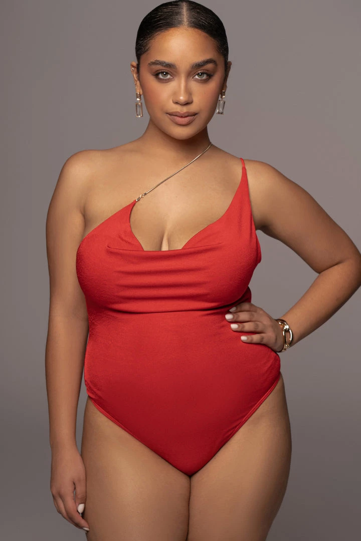 EXCLUSIVELY DESIGNED BY US FOR YOU. Own the night with our RED ROLE MODEL BODYSUIT! Featuring a stunning cowl neckline with a thin camisole strap and a gold tone metal hardware strap that can be removed. Crafted in our smooth double lined slinky fabric for superior fit. Complete with a thong bottom and double snap closure. Solid straps are non adjustable. Stretchy.