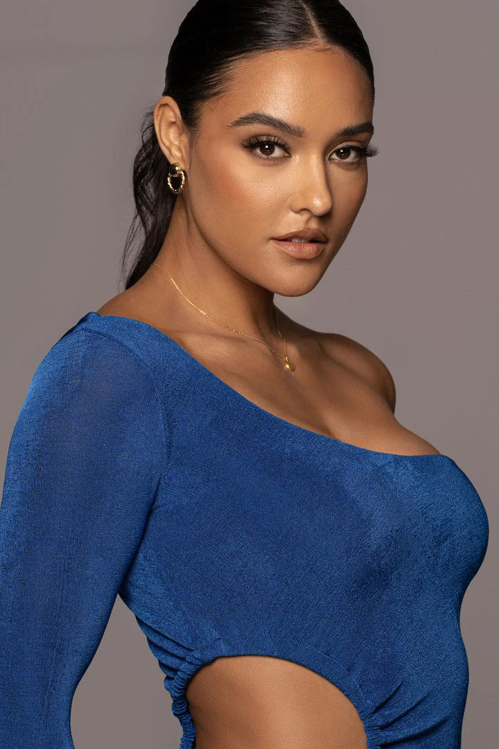 EXCLUSIVELY DESIGNED BY US FOR YOU. Take your look somewhere new in our ROYAL IN THE MOMENT DRESS! Designed in our double line slinky fabric, this elegant dress turns up the glamour to captivating measures. Featuring a one shoulder neckline with one full sleeve and a bold cutout at the waist detailing a stylish drawstring tie. Midi hem. Stretchy.