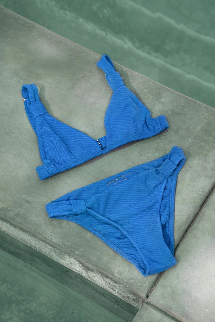EXCLUSIVELY DESIGNED BY US FOR YOU. Chase the sun all season long in our ROYAL YUBA PERFECT CUT BIKINI! This two piece swim set is constructed of stretchy ribbed fabric and features a triangle cut bikini top with adjustable straps and a back clasp closure. Cheekini bottoms offer the perfect amount of coverage while complimenting all your natural curves! Moveable loops accent both the top and bottoms for a finishing touch. Double lined. Unpadded. Sold as set.