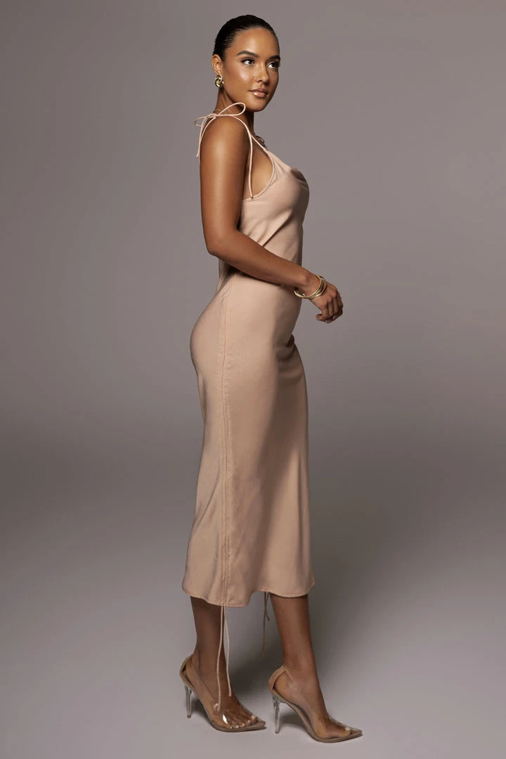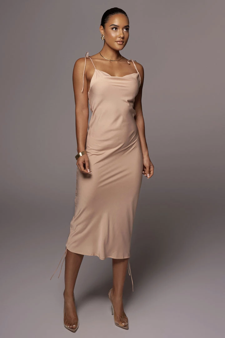EXCLUSIVELY DESIGNED BY US FOR YOU. The ’90s are back with our BEIGE PHOEBE SLIP DRESS! This stunning slip dress showcases a cowl neckline with thin shoulder straps that tie at the top and adjustable drawstrings on both sides taking your look from a maxi style to mini in seconds. Slightly sheer and soft fabric with limited stretch. Lined bust.