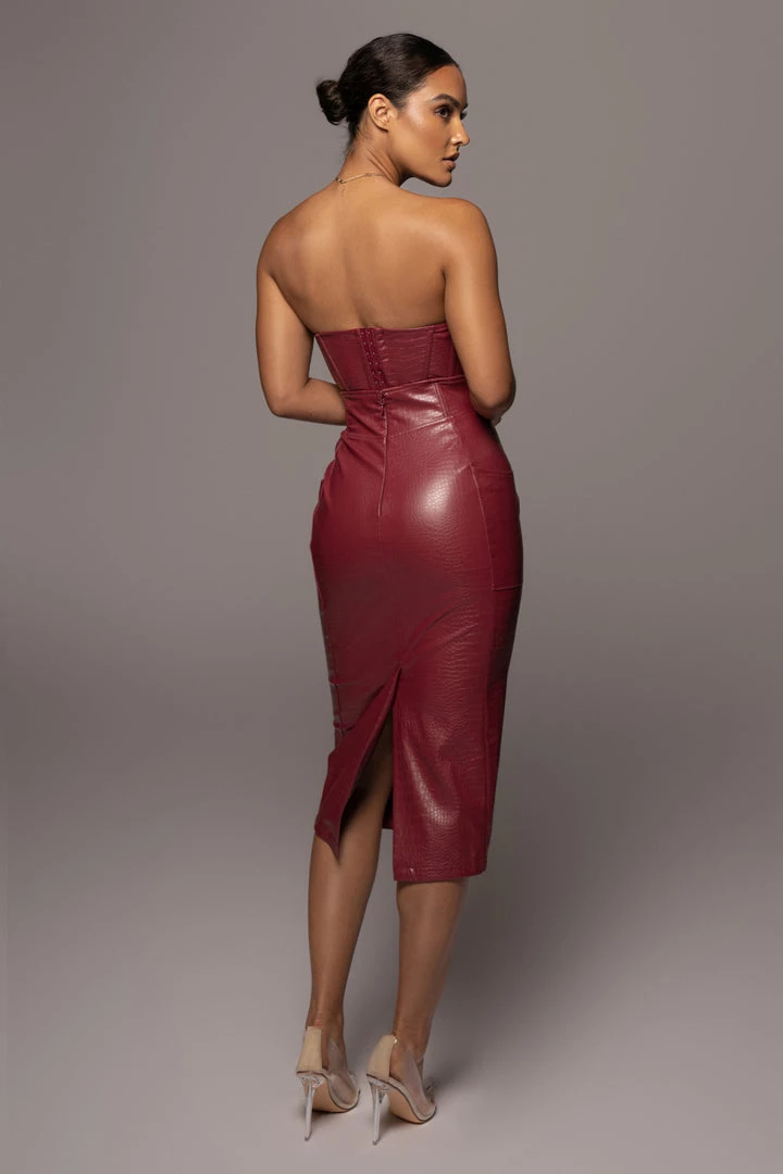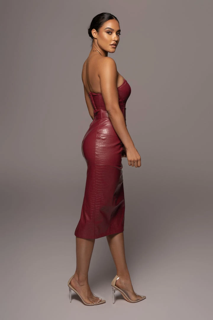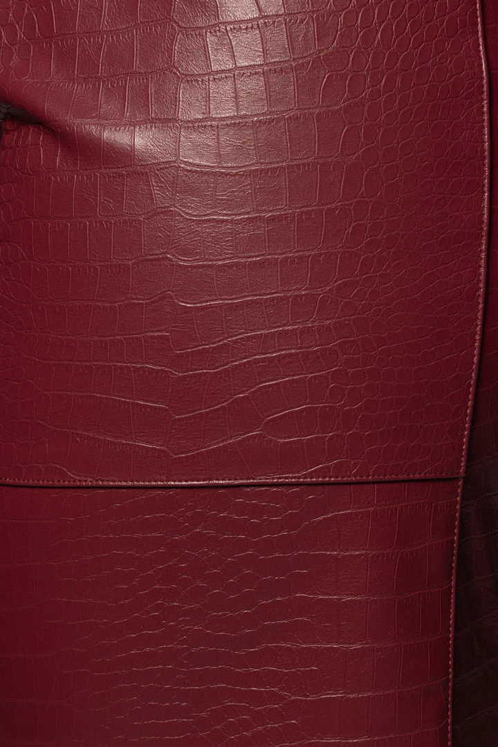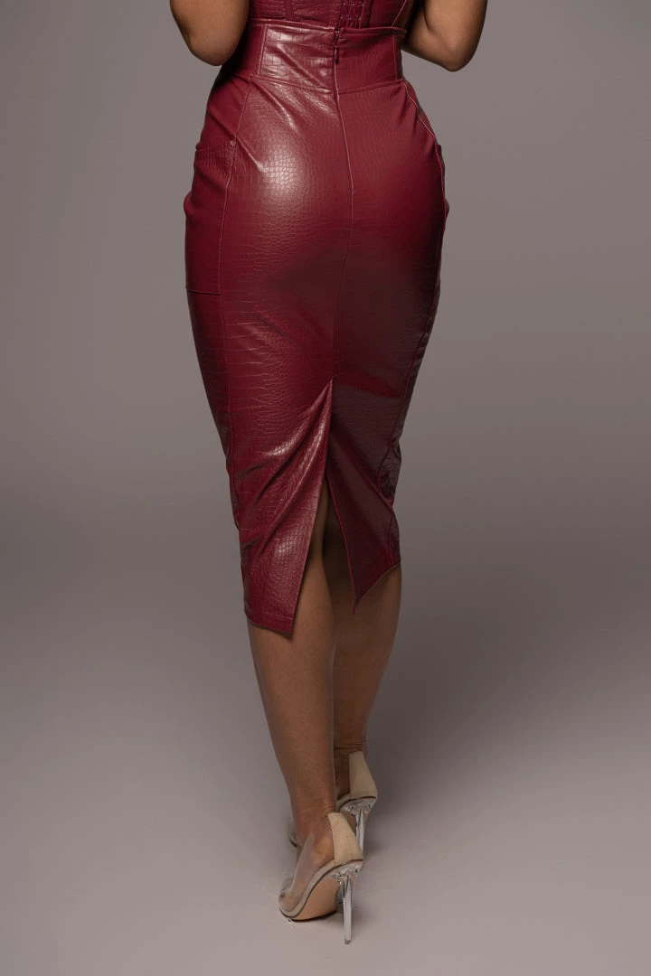 EXCLUSIVELY DESIGNED BY US FOR YOU. From work meetings to a night out for drinks, the BERRY DELISA CROC SKIRT will leave its mark every time! Crafted in an alluring croc embossed fabric, this high waisted skirt comes with boning at the waist for a figure flattering fit, two side pockets, and a lower slit located in the center back. Complete with suede like interior for comfort and hidden back zipper closure. Pair with our JAELYN CORSET TOP for the full look. Minimal stretch.