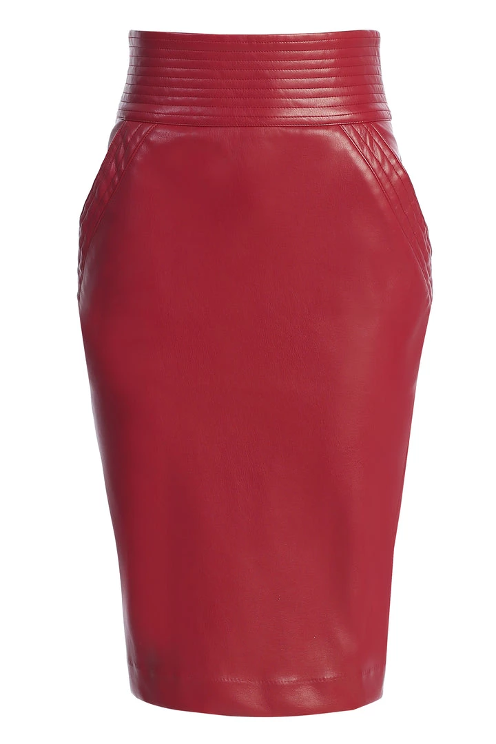 EXCLUSIVELY DESIGNED BY US FOR YOU. Get your way every time in our new BERRY ELVRY SKIRT! Topped with a thick ribbed waistband, this stunning leather skirt comes with two functional side pockets and a side zipper closure. A slit at the lower hem provides easy movement. Complete with a smooth suede backing for comfort. Pair with the ALEXIA BUSTIER for the full look. Some stretch.
