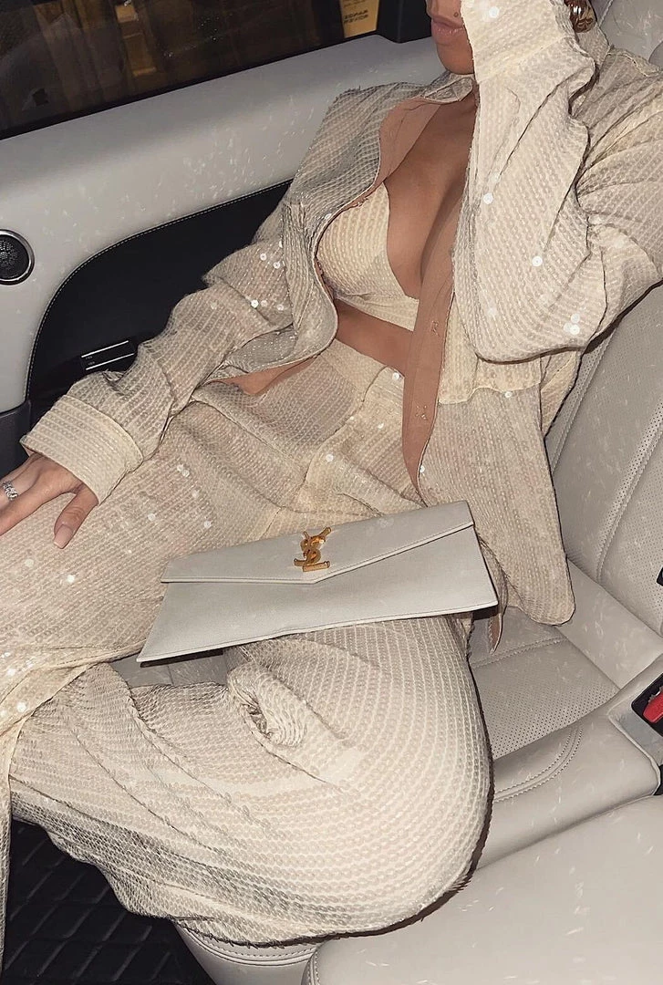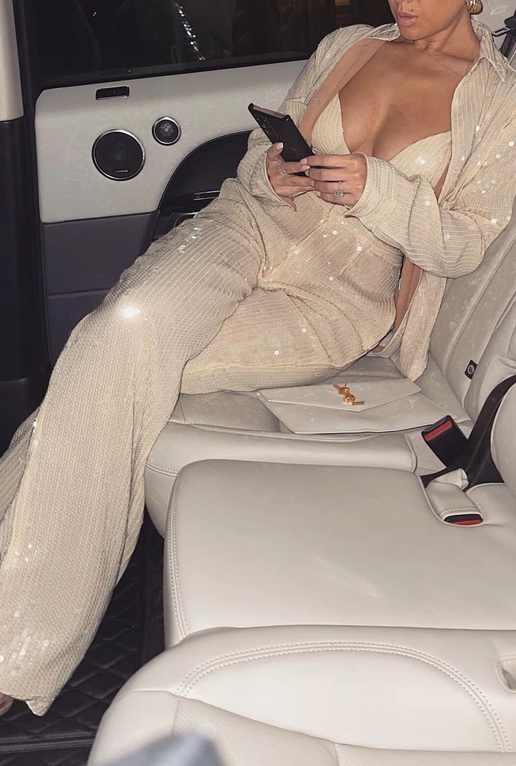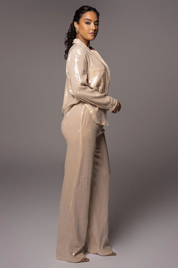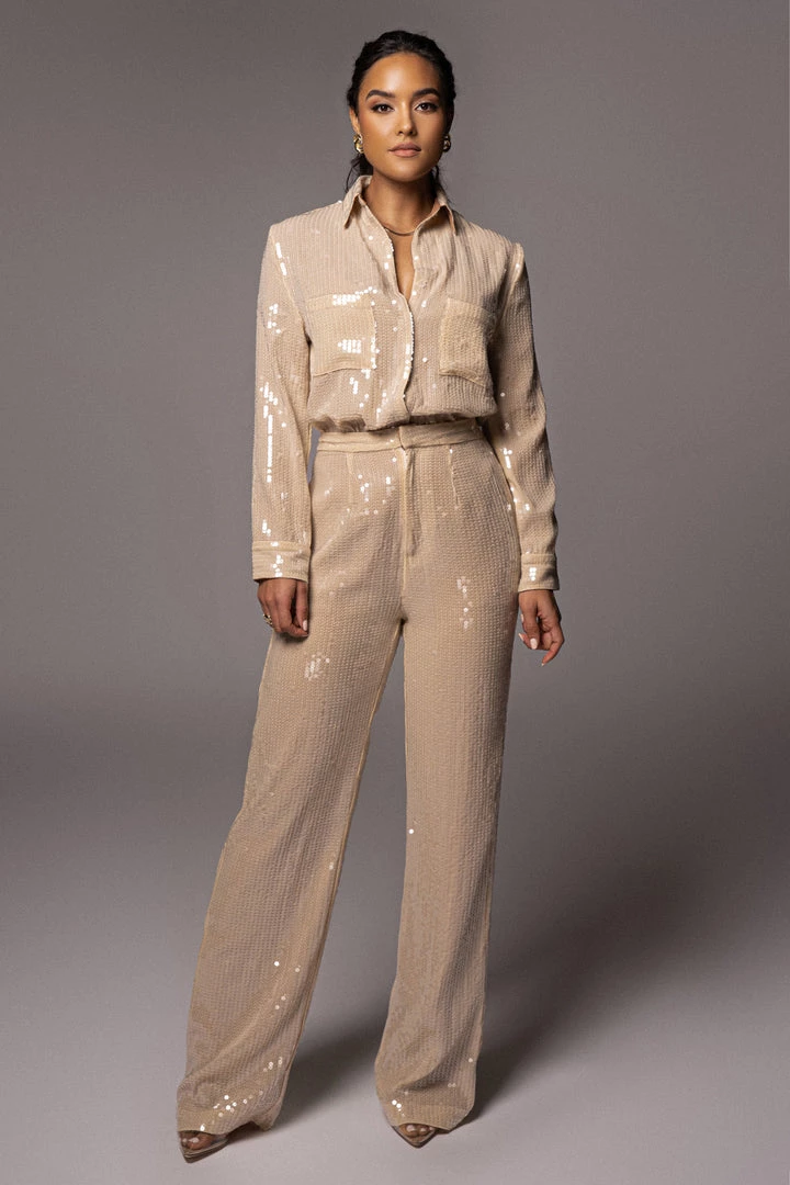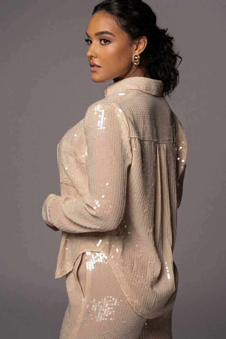 EXCLUSIVELY DESIGNED BY US FOR YOU. Add shimmer to the season in our BUTTERCREAM BAGUETTE SEQUIN BUTTON UP! A classic button up blouse featuring full sequin detailing with long sleeves, a front bust pocket, and soft solid chiffon lining creating a monochrome look. Complete with hidden snap buttons down the center bodice for closure. Pair with our ZINNIA SEQUIN BRALETTE and ELOWEN SEQUIN TROUSERS for the full look. Limited stretch.