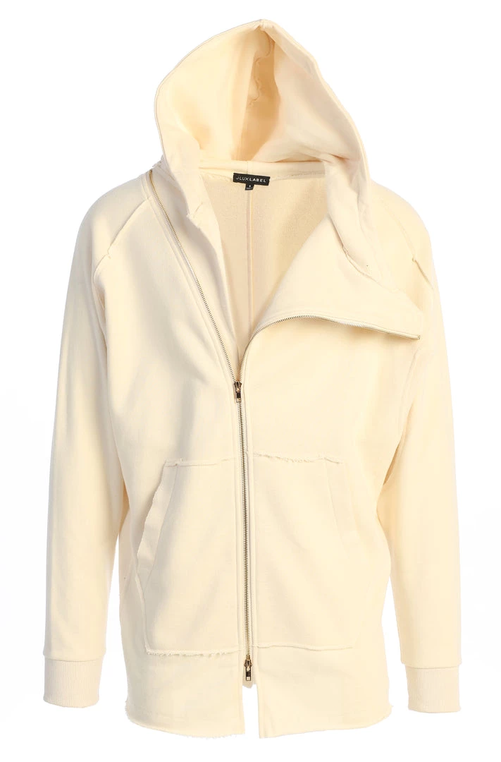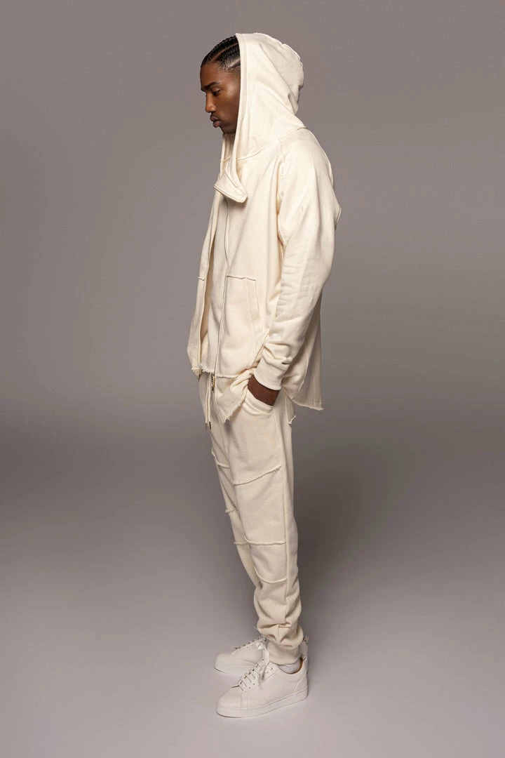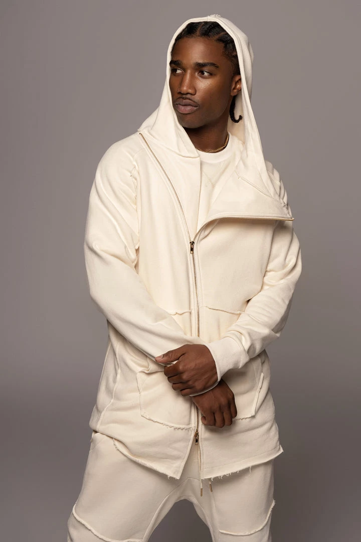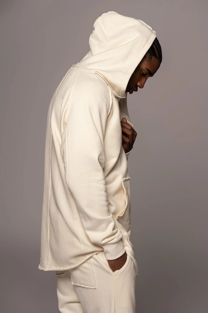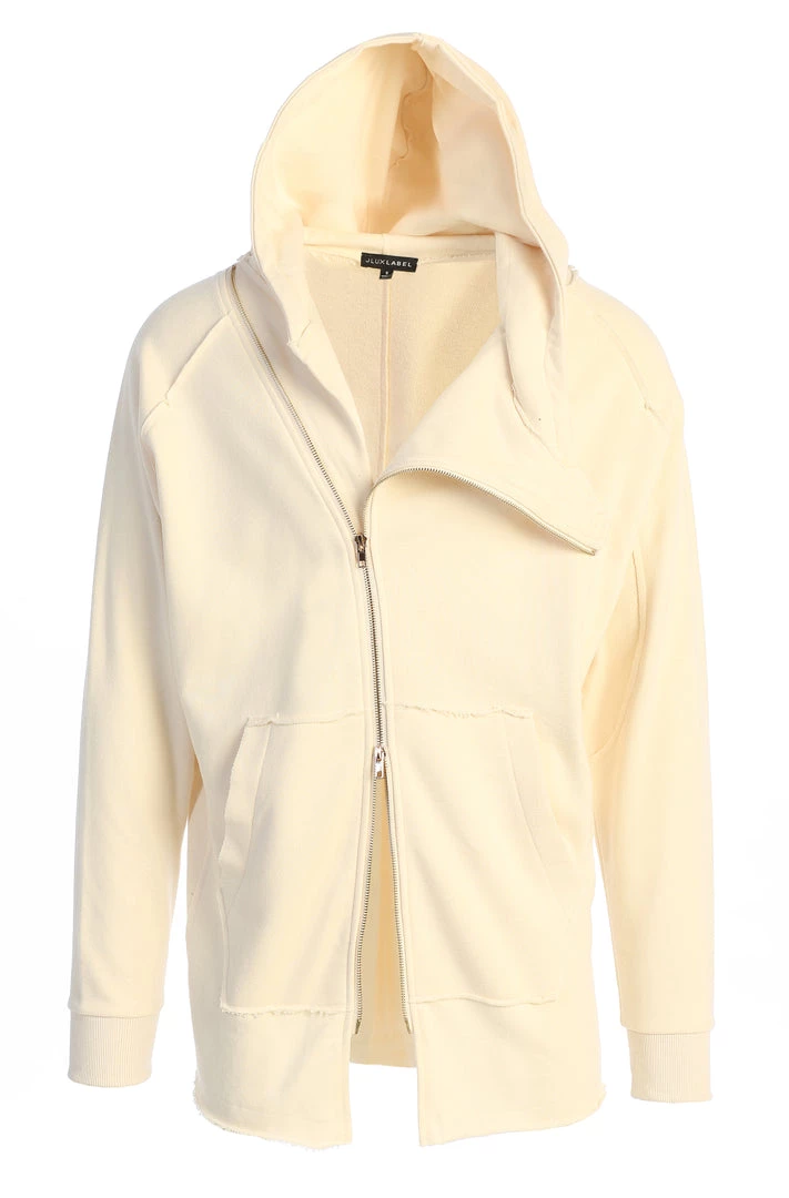 EXCLUSIVELY DESIGNED BY US FOR HIM. Our BUTTERCREAM JORDYN MEN’S ZIP UP adds a sharp touch to your ensemble any day! Designed in a soft and stretchy blend, this long sleeve men’s hoodie features a hooded neck with a two way asymmetric zipper, split kangaroo pockets, and raw cut details throughout with a raw hemline. Pair with our KALEB MEN’S JOGGERS and LOGAN RAW EDGE TEE for the full look. Fitted cuffs.Oversized.