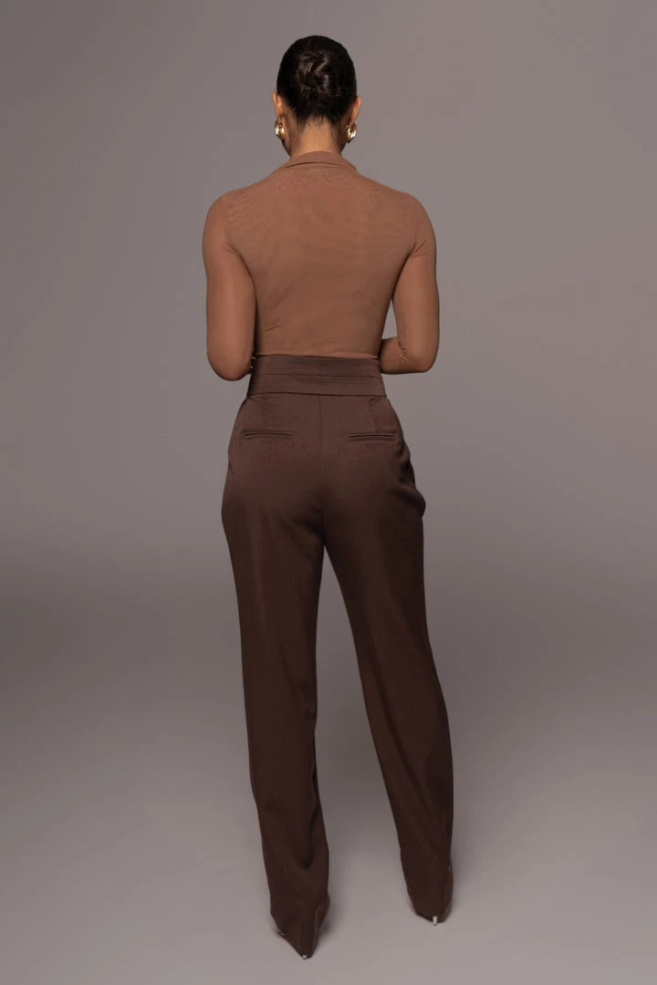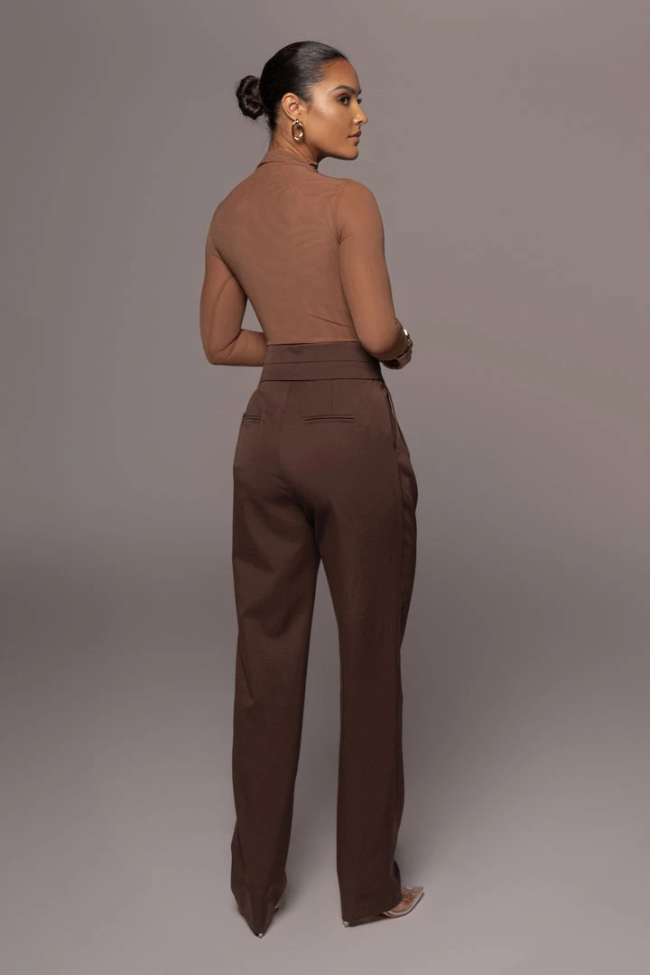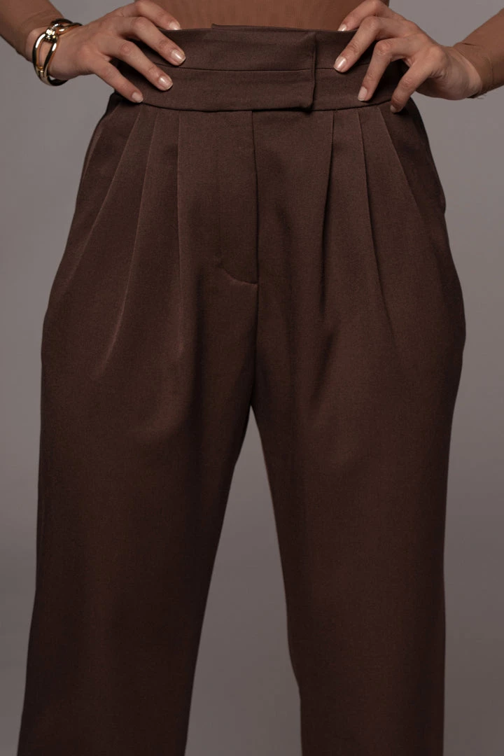 EXCLUSIVELY DESIGNED BY US FOR YOU. Our CHOCOLATE AERIN TROUSERS are made for days in the city! Mix things up in these classy high waist trousers topped with a thick waistband featuring a pleated front with straight leg hems. Complete with two functional side pockets, faux back pockets, and a hidden zipper with double hook and bar closure. These high waist trousers are a perfect work to weekend staple that still catches the eye! No stretch.