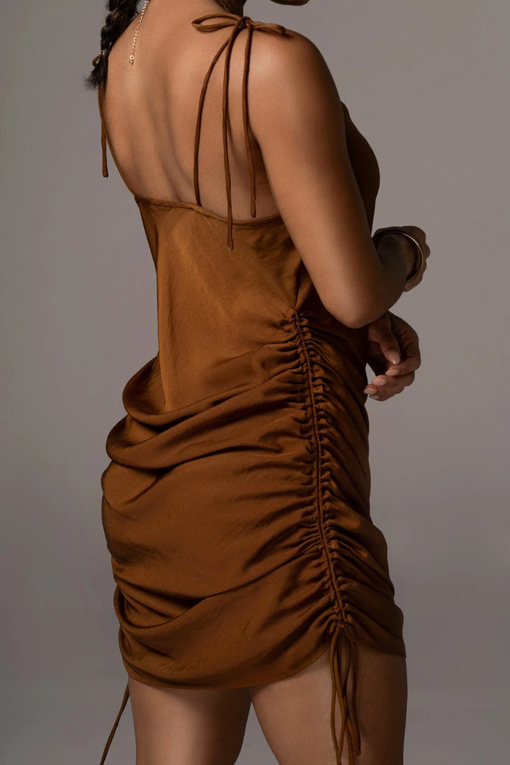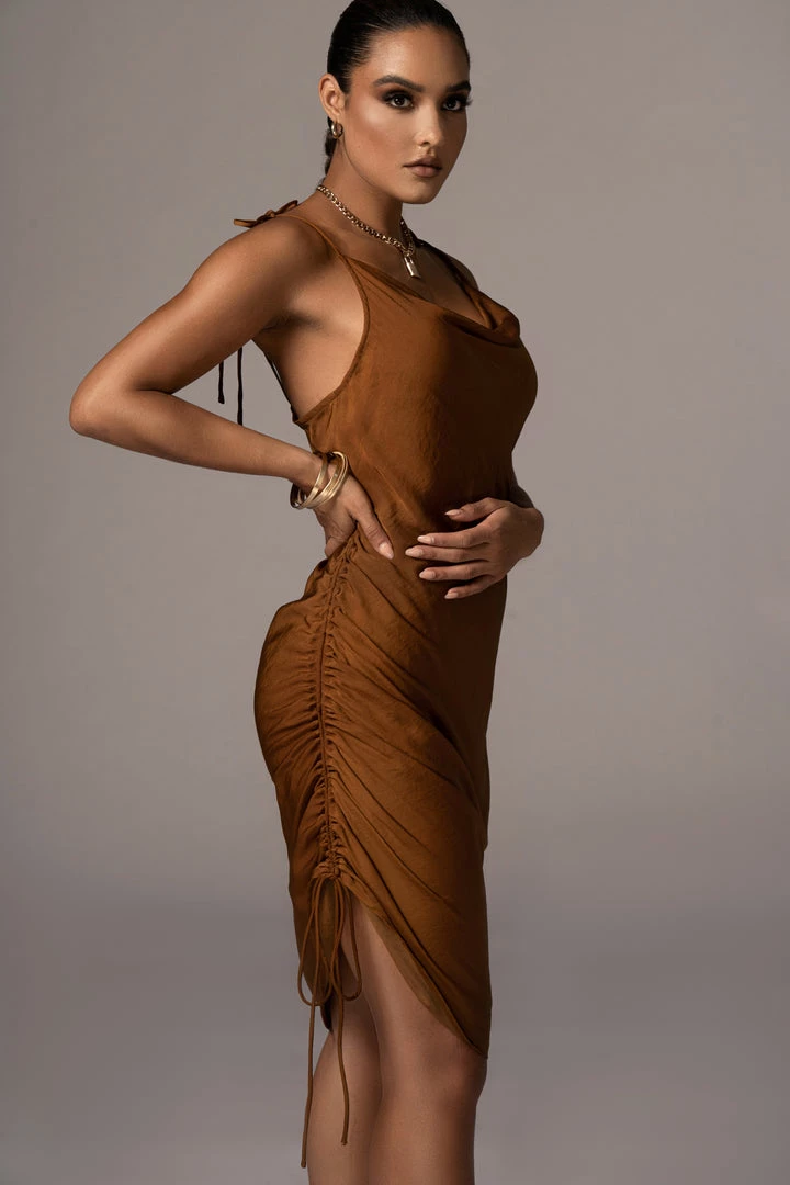 EXCLUSIVELY DESIGNED BY US FOR YOU. The ’90s are back with our COCOA PHOEBE SLIP DRESS! This stunning slip dress showcases a cowl neckline with thin shoulder straps that tie at the top and adjustable drawstrings on both sides taking your look from a maxi style to mini in seconds. Slightly sheer and soft fabric with limited stretch. Lined bust.
