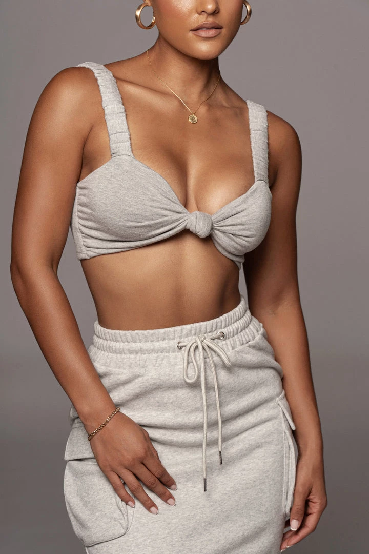 EXCLUSIVELY DESIGNED BY US FOR YOU. Take your crop top wardrobe to new levels in our GREY KILEY CROP TOP! This stunning bralette top highlights a sweetheart neckline with front knot detail, elastic ruched tank shoulders, and an elastic ruched back. Designed in a soft fabric with mesh interior lining for a quality feel. Add our STEEL FLEECE CARGO SKIRT to your look for an elevated ensemble that outshines the competition. Stretchy.