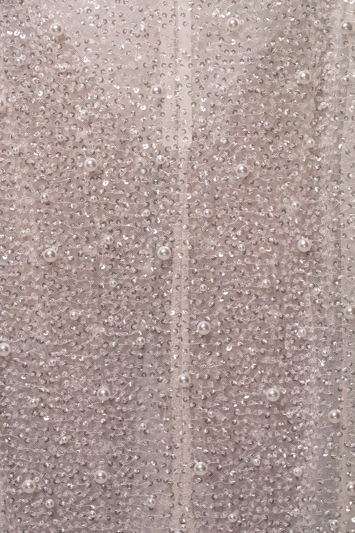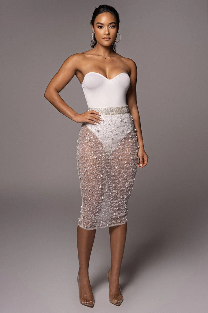 EXCLUSIVELY DESIGNED BY US FOR YOU. Our IVORY YVAINE RHINESTONE MIDI SKIRT is a true gem! Designed in a beaded sequin mesh fabric with mesmerizing pearls, this see through midi skirt comes with a rhinestone embellished waistband, a bodycon silhouette, and a lower back center slit. Pair with our MONROE SHAPEWEAR BUSTIER BODYSUIT for the full look. Metal back zipper closure. No stretch.