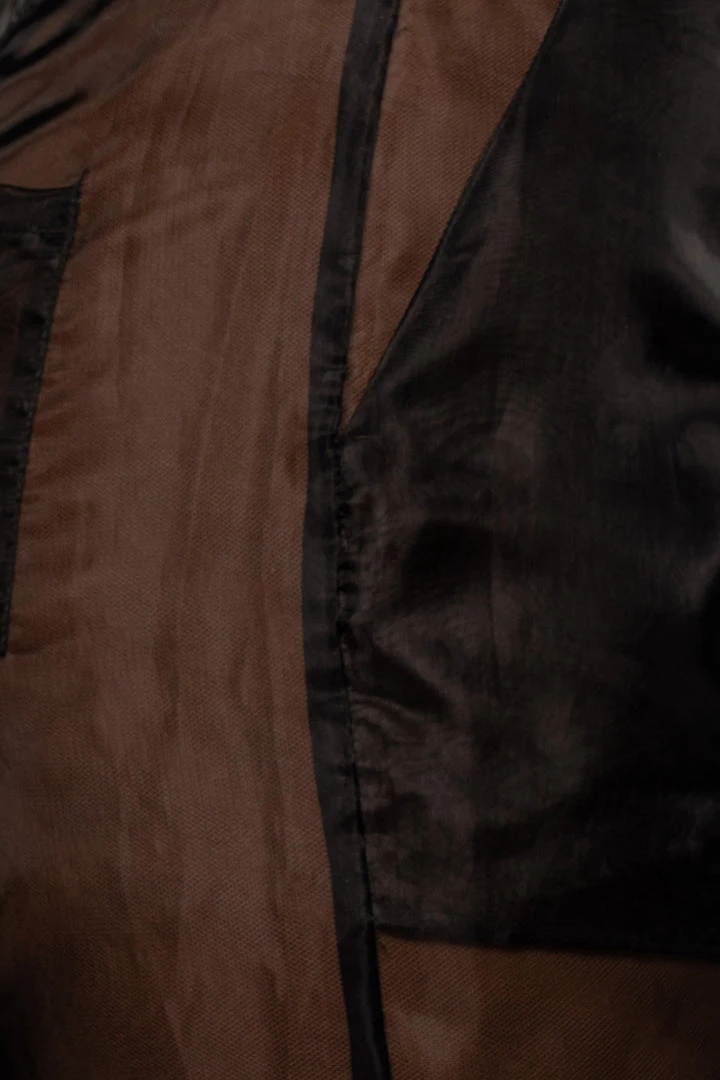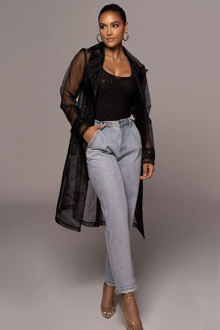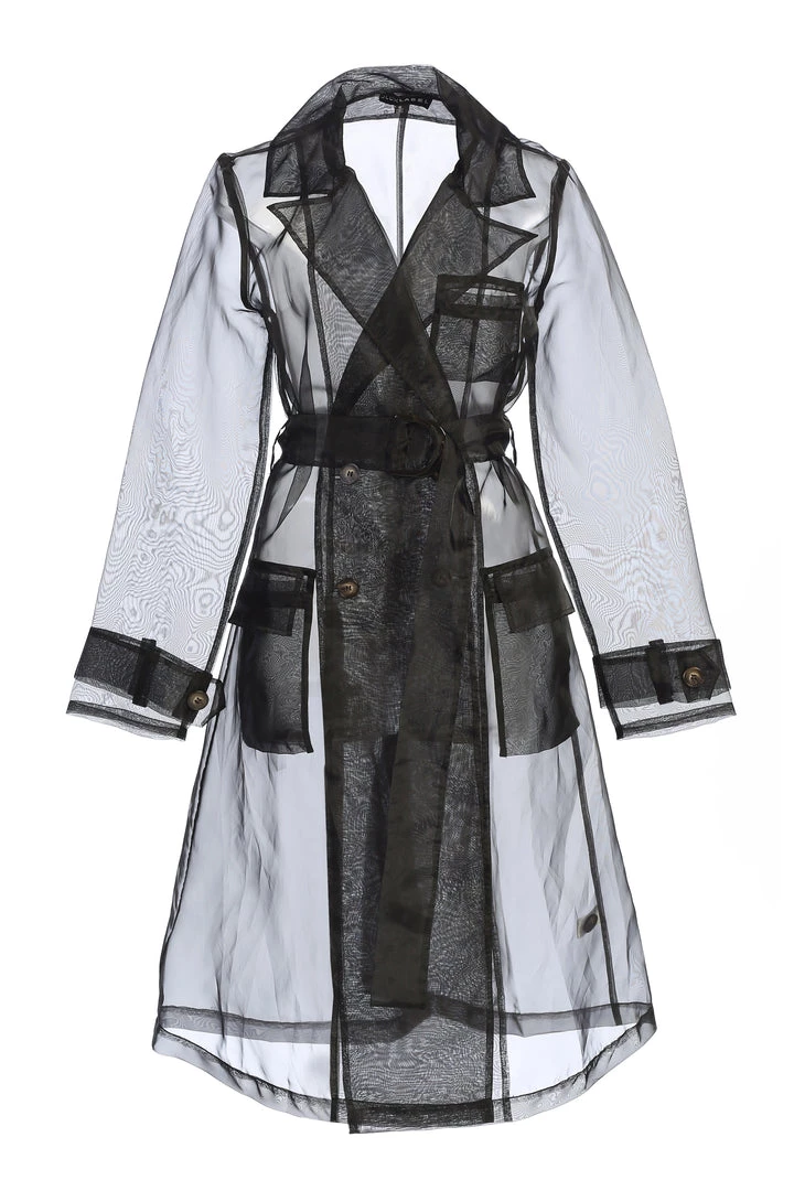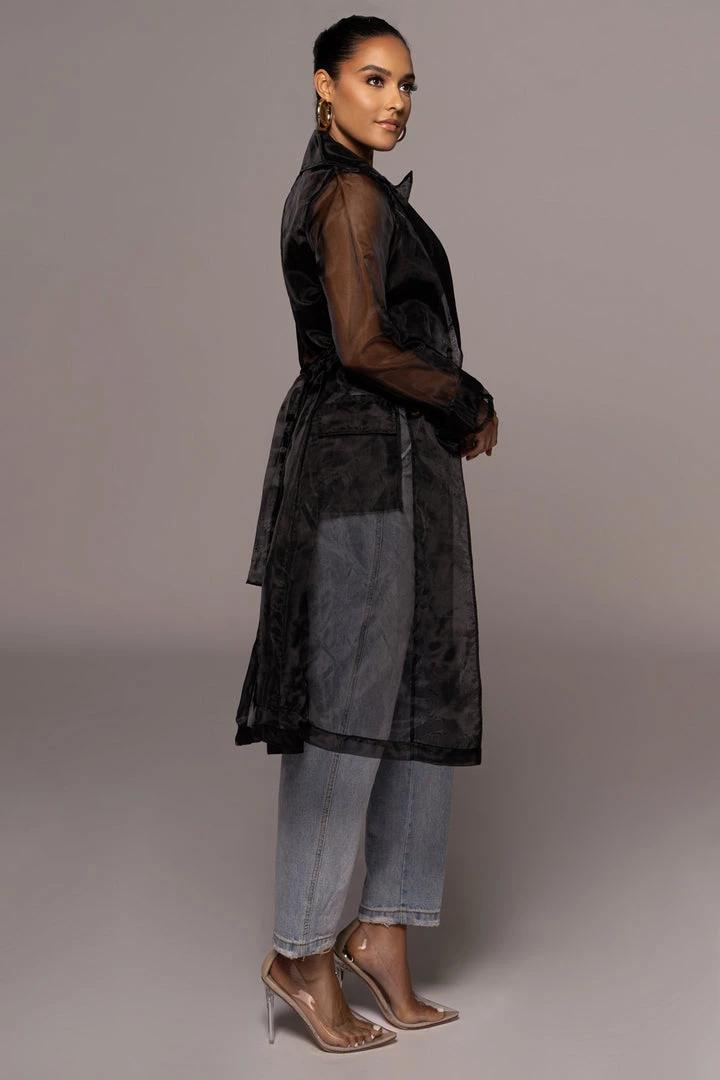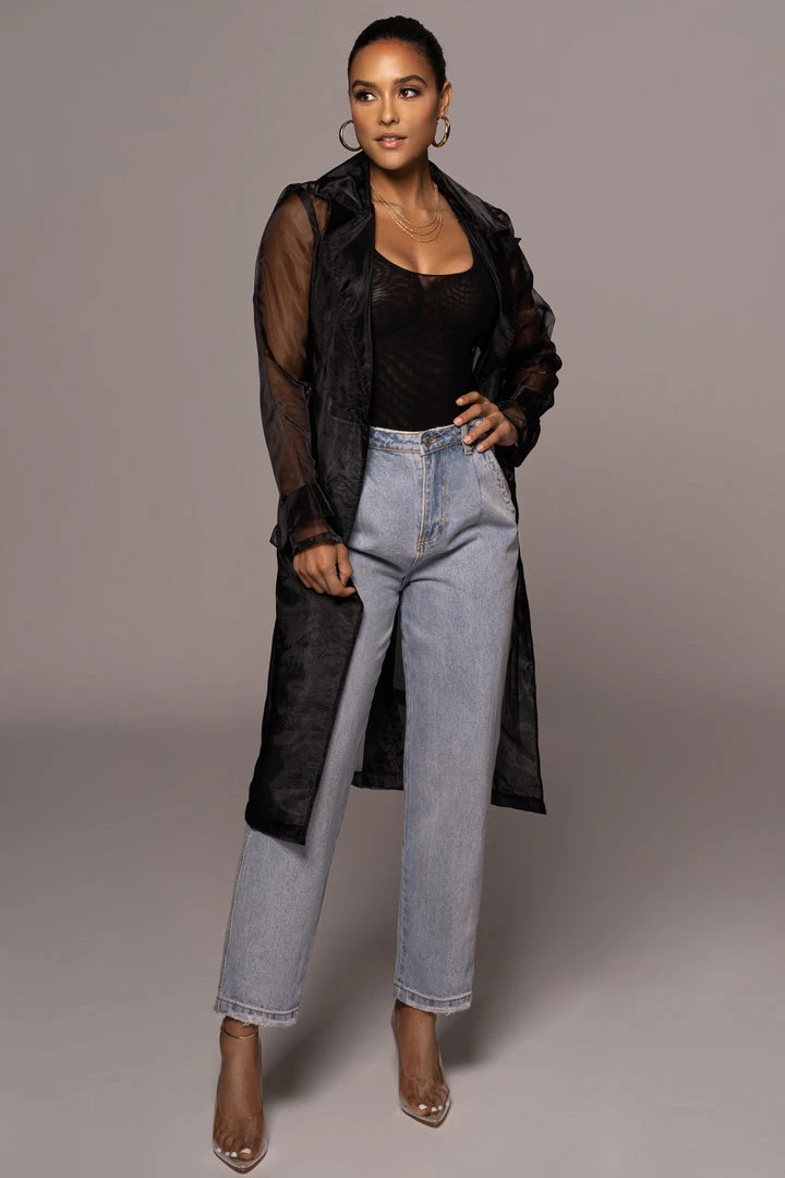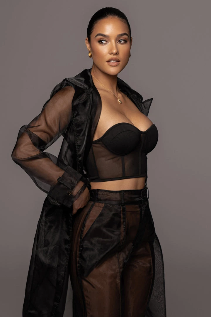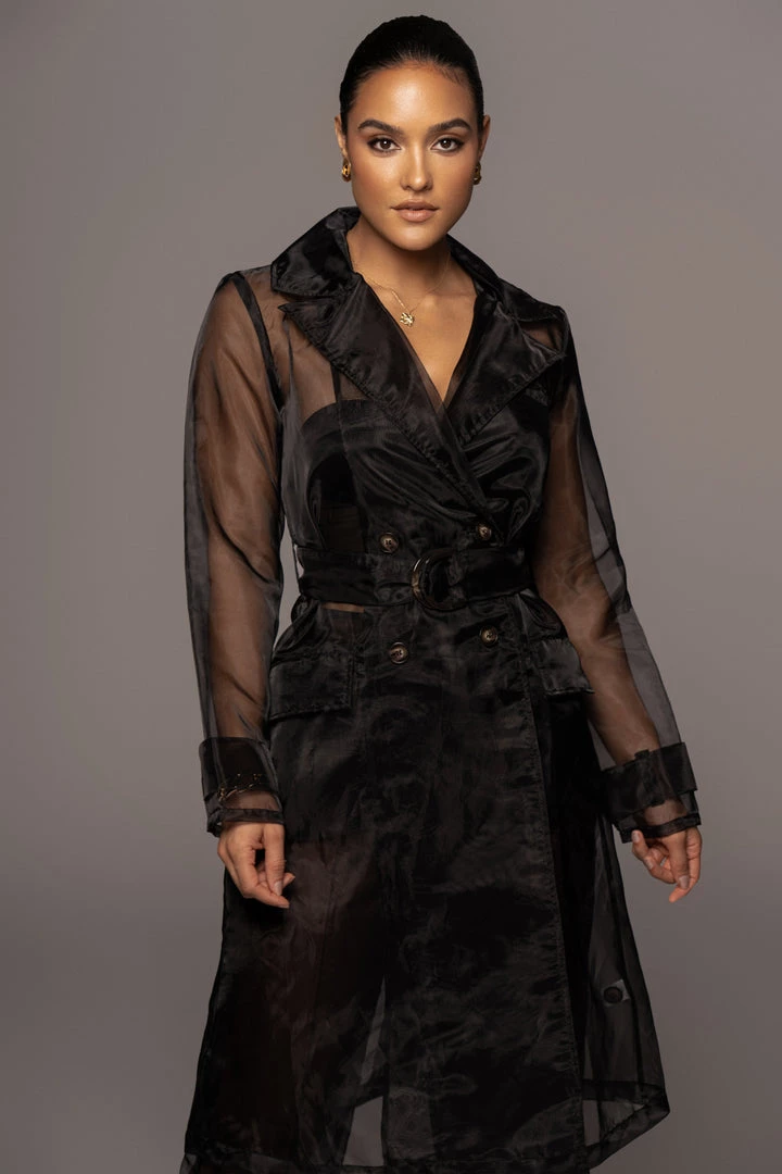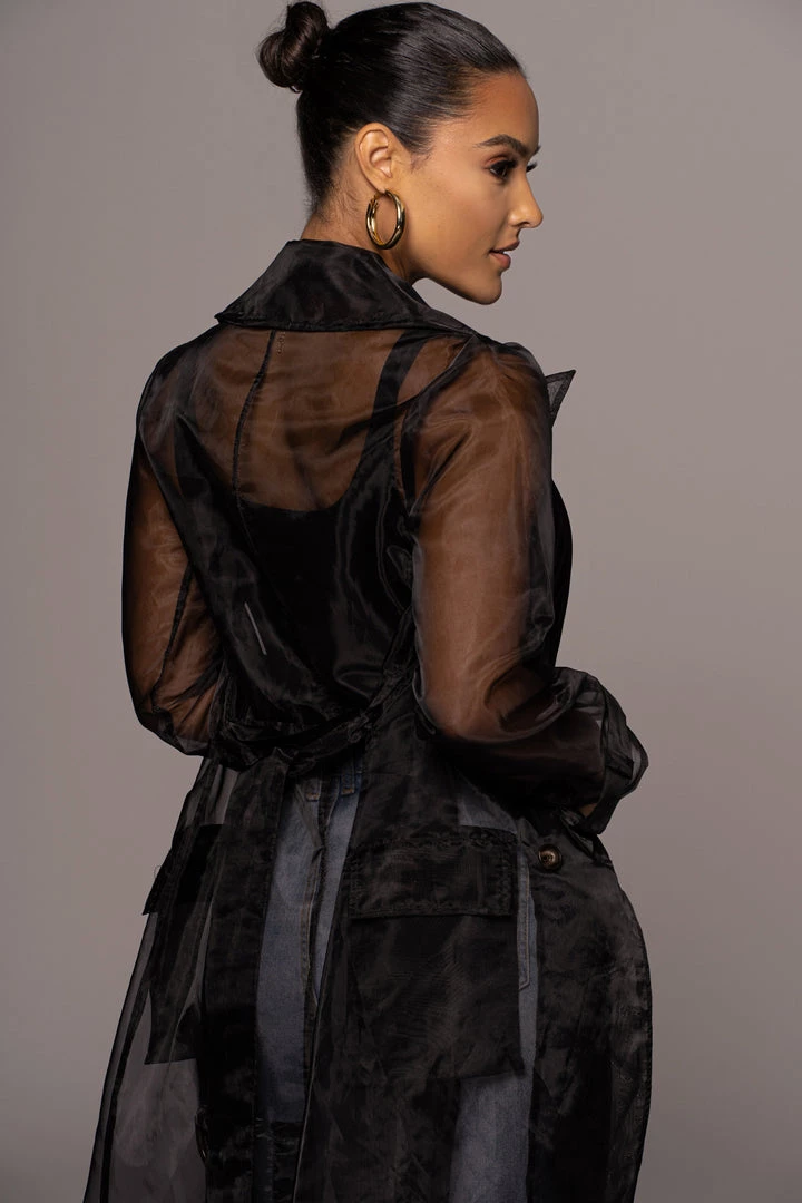 EXCLUSIVELY DESIGNED BY US FOR YOU. Our NOIR JEANNA COAT is edgy and ethereal all at once! Designed in a sheer organza fabric, this longline statement coat showcases notch lapels with long sleeves, one welt pocket at the bust, two front flap pockets, and a double breasted bodice. A matching belt detailing a stylish tortoise D-ring buckle adds a finishing touch! Pair with the LIVY ORGANZA PANTS and SHAYLA BUSTIER for the full look. No stretch.
