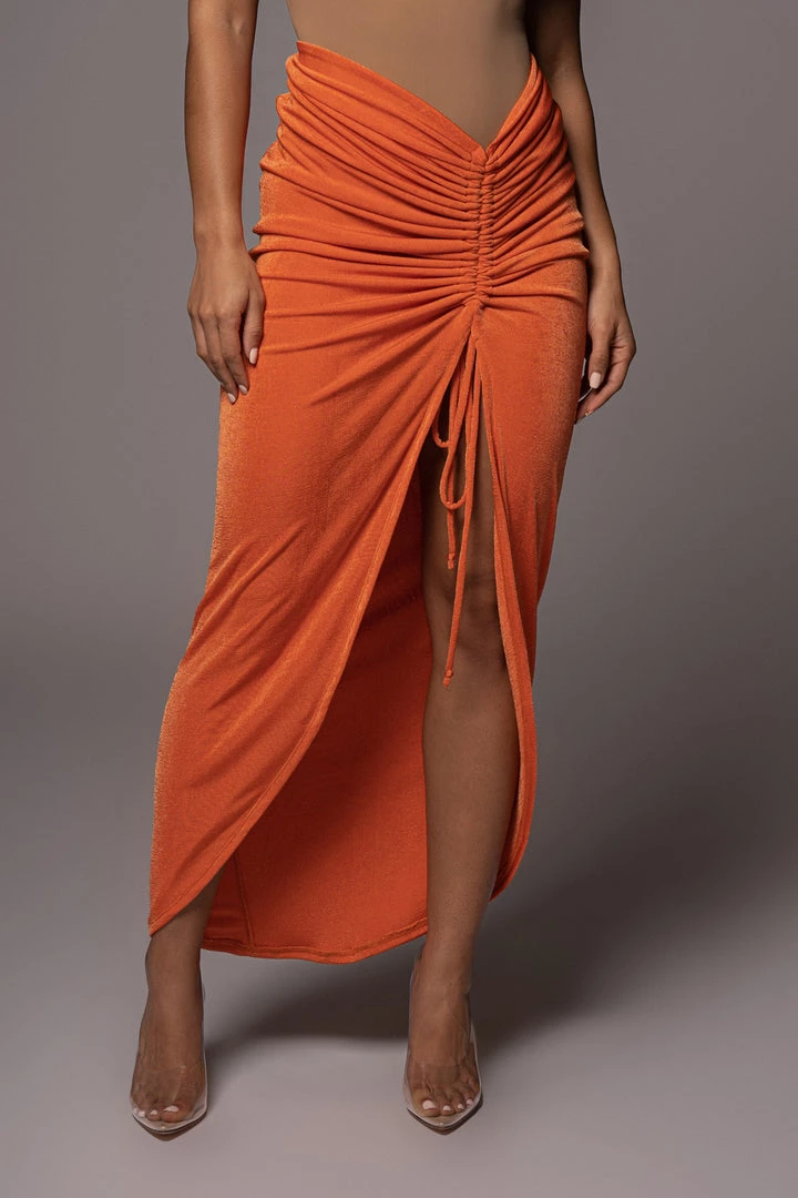 EXCLUSIVELY DESIGNED BY US FOR YOU. Our ORANGE HANNA SLINKY SKIRT is so captivating you’ll have all eyes on you! We decided to take our best seller the Aura slinky skirt and renew it in a classy maxi hem. Crafted in our slinky fabric, this maxi length skirt features an adjustable drawstring on one side with ruched detail and a flirty side slit. Complete with an adjustable drawstring for the desired length. Pair with our KENZIA HIGH NECK BODYSUIT for the full look. Stretchy.