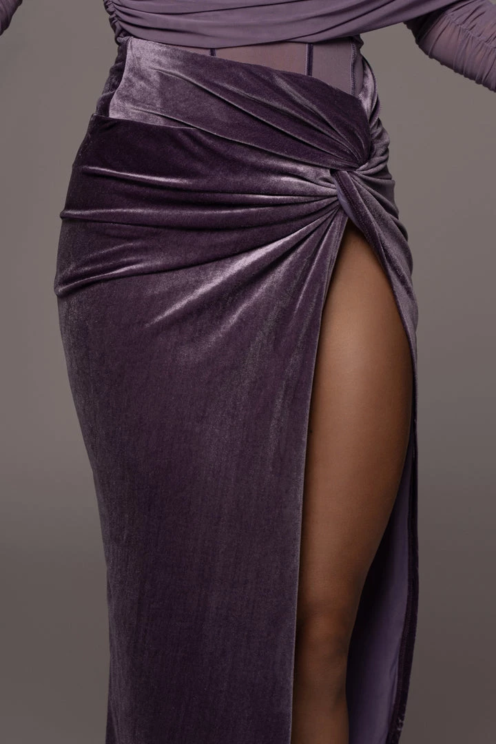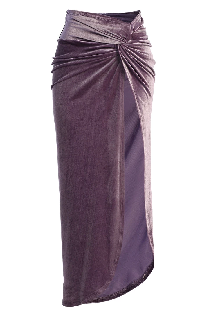 EXCLUSIVELY DESIGNED BY US FOR YOU. You’ll be dancing until sunrise with our PURPLE DANCE THE NIGHT AWAY SKIRT! We’ve taken our best seller the NAMYA KNOTTED SKIRT and gave it new meaning in soft velvet fabric for a dreamy vintage touch. Featuring a front knot detail that creates a stunning drape effect with a playful side slit to finish the look. The design is complete with an elastic waistband and sheer interior lining. Stretchy.