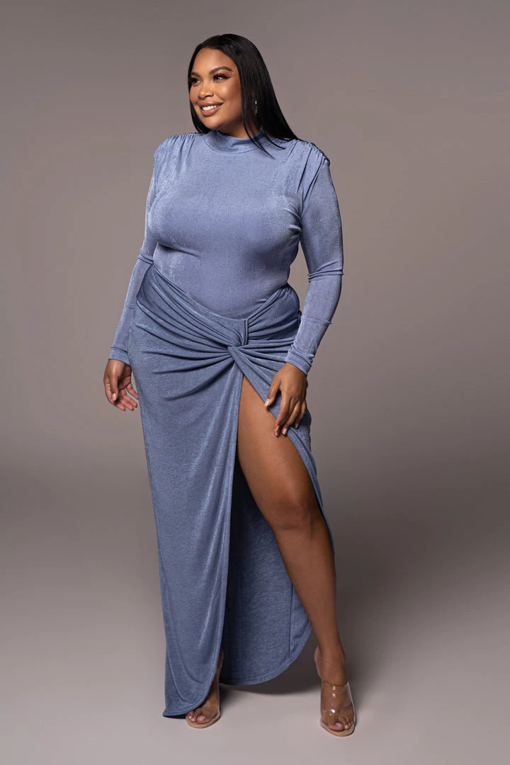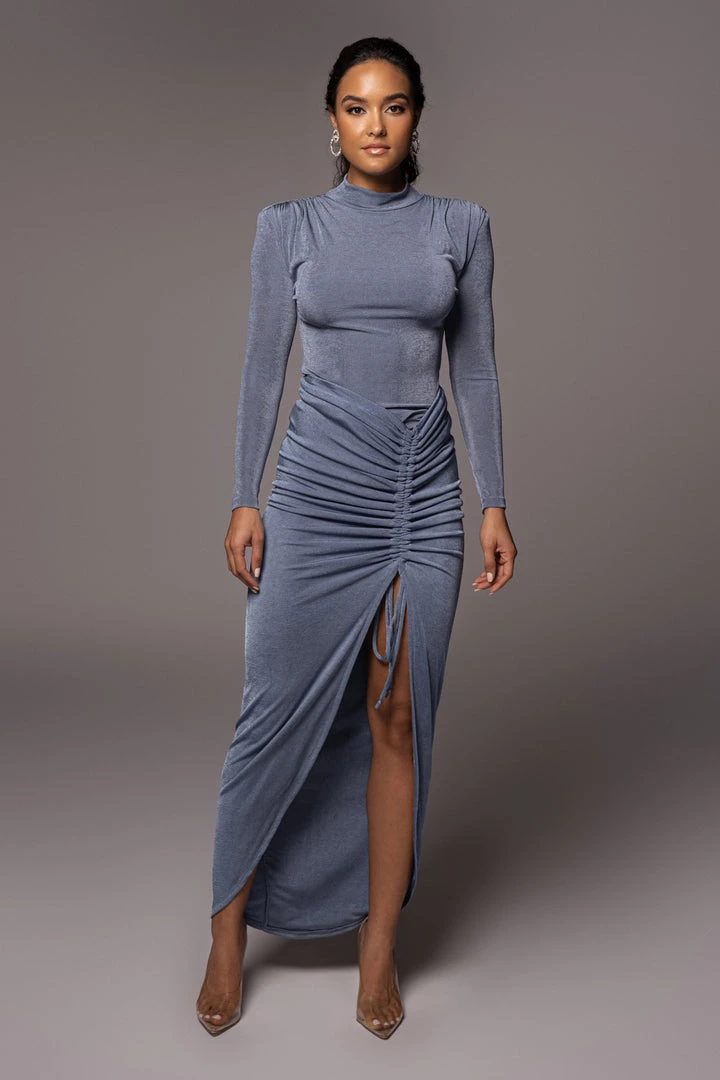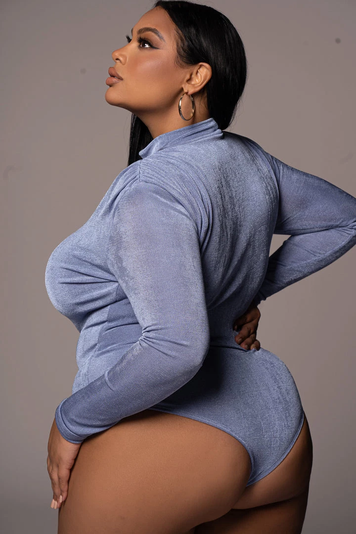 EXCLUSIVELY DESIGNED BY US FOR YOU. Our SLATE KENZIA HIGH NECK BODYSUIT will become the new go to for all your night outings! Designed in our favorite slinky double lined fabric, we bring you our finest bodysuit yet. This long sleeve bodysuit showcases a mock neckline and gathered shoulders with padding for a classy yet structured look. Complete with a thong bottom and double snap closure. Breathable and stretchy fabric. Double lined.
