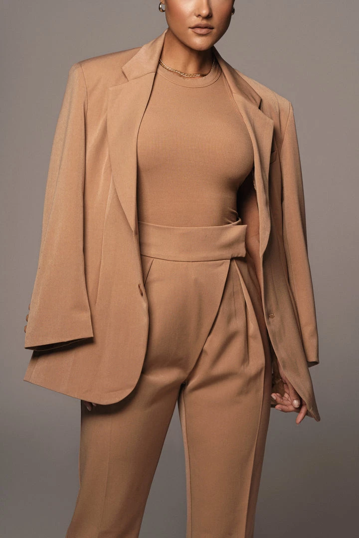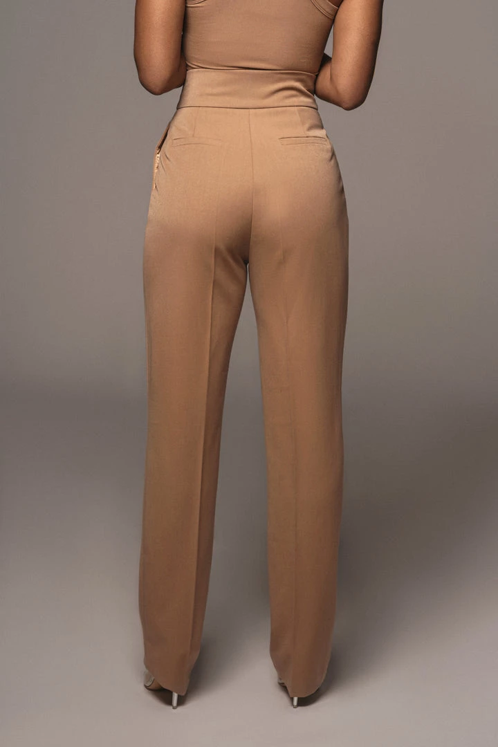 EXCLUSIVELY DESIGNED BY US FOR YOU. Mix things up in our TAN ALAIA WIDE LEG PANTS. These classy trousers feature a straight leg silhouette with faux back pockets and an adjustable asymmetric velcro waistband for the desired fit. Complete with button and zipper closure. Pair up with our AMORA STRUCTURED BELTED BLAZER for a work to weekend look that catches the eye! Minimal Stretch. Lined.