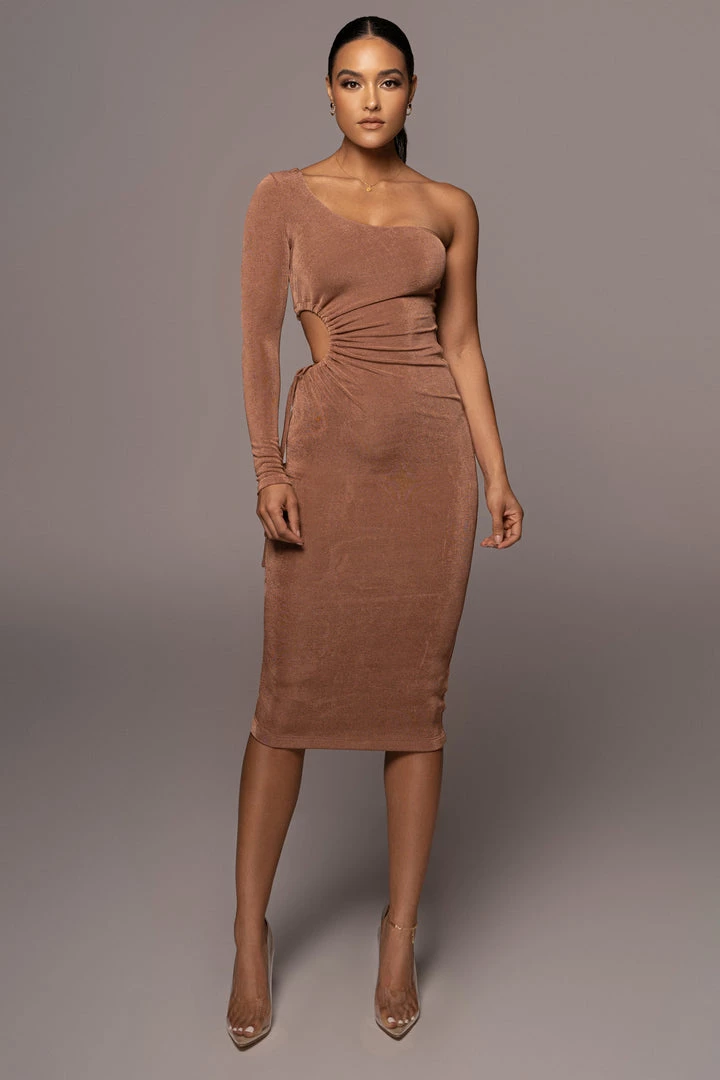 EXCLUSIVELY DESIGNED BY US FOR YOU. Take your look somewhere new in our TAN IN THE MOMENT DRESS! Designed in our double line slinky fabric, this elegant dress turns up the glamour to captivating measures. Featuring a one shoulder neckline with one full sleeve and a bold cutout at the waist detailing a stylish drawstring tie. Midi hem. Stretchy.