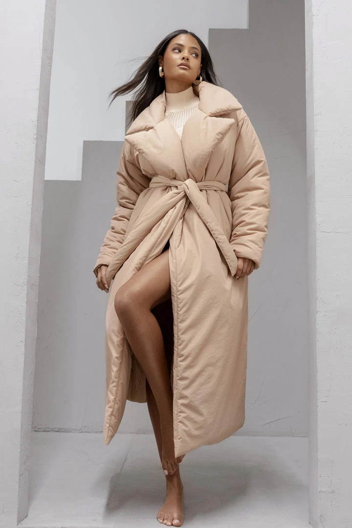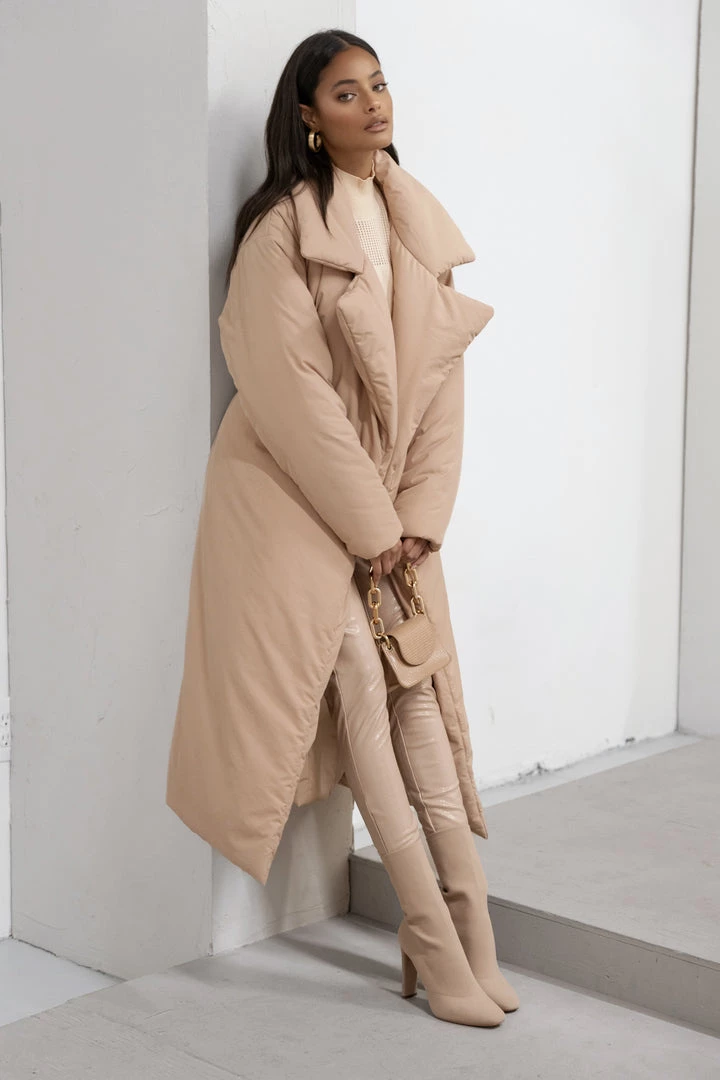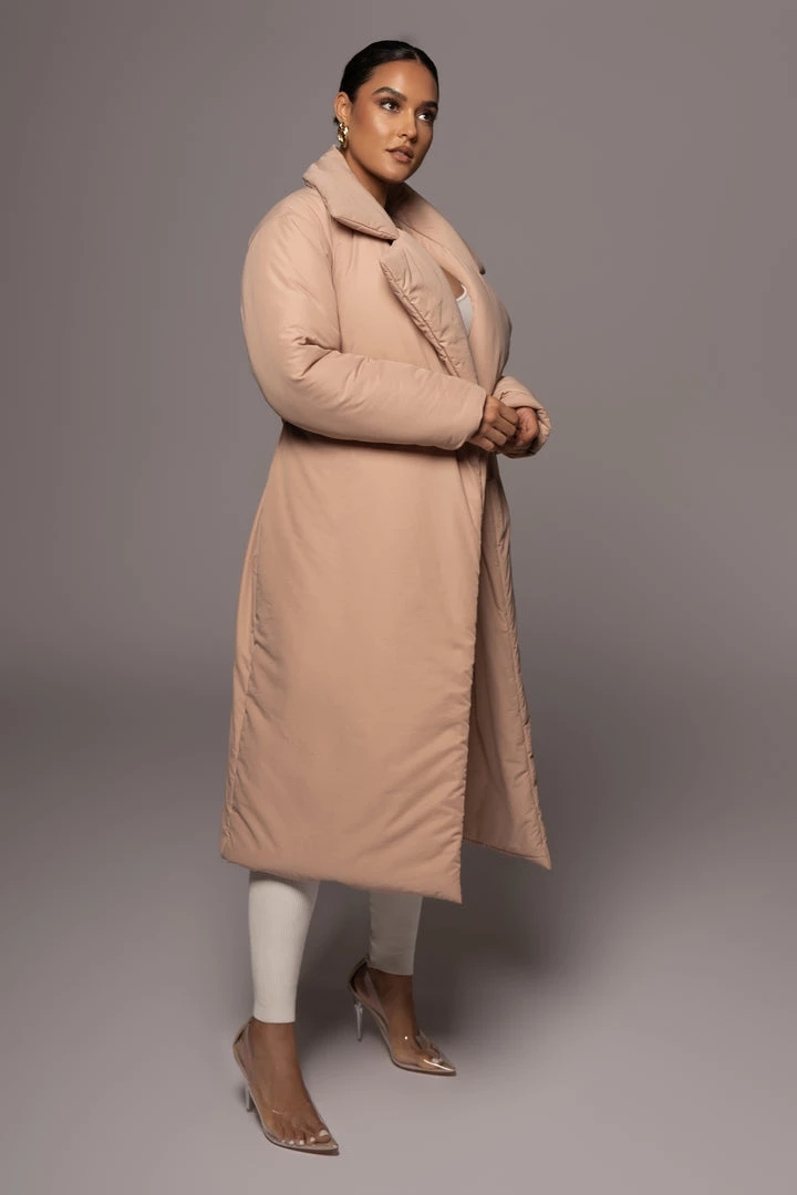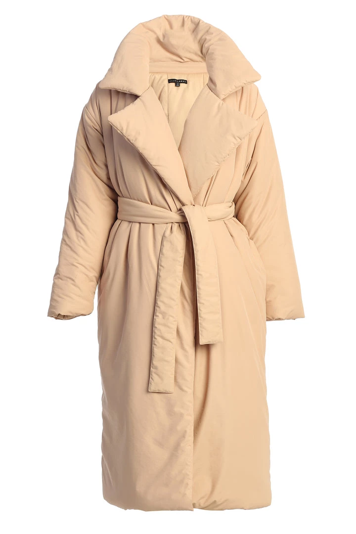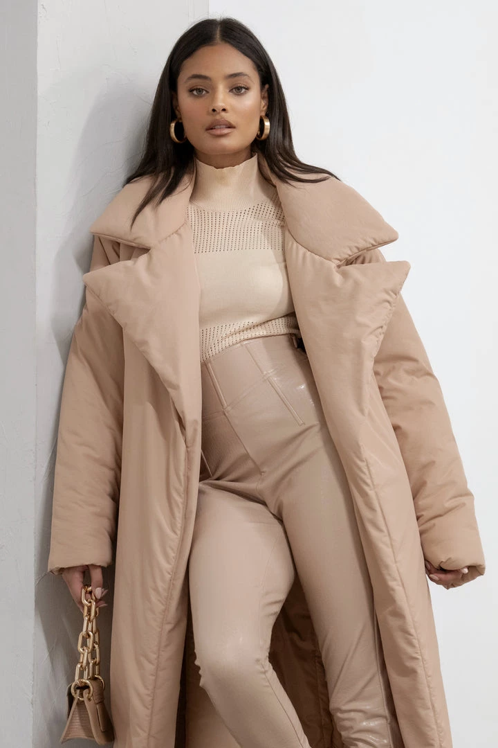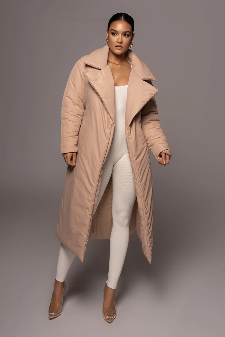EXCLUSIVELY DESIGNED BY US FOR YOU. We are staying one step ahead of the cold in the TAN LIMITLESS PUFFER JACKET! This longline puffer coat features a notch lapel collar with long sleeves, two side pockets, fitted cuffs, and a removable matching tie belt to hold it all together. Oversized fit. Minimal stretch.