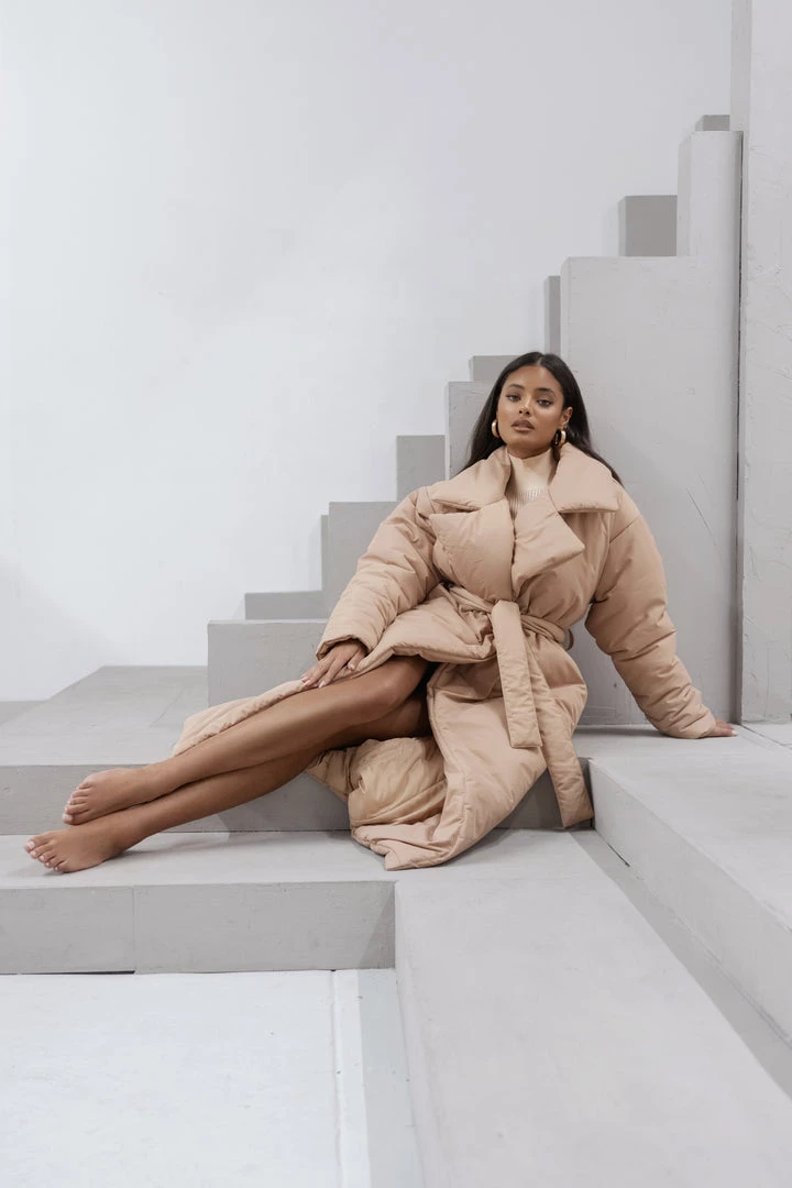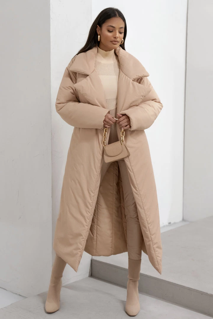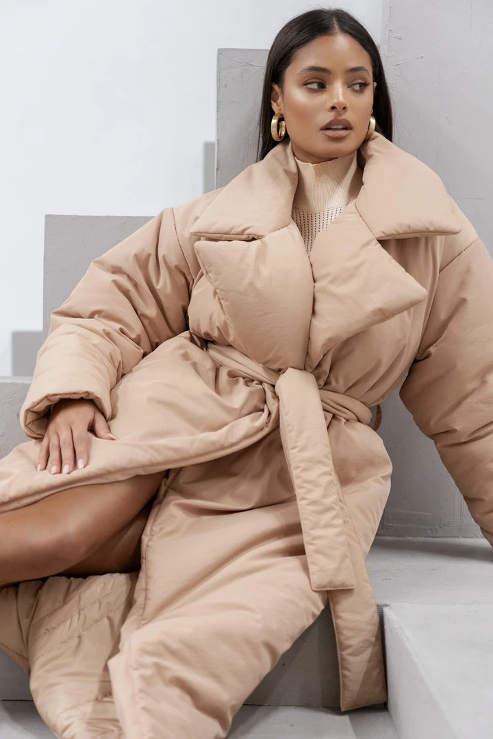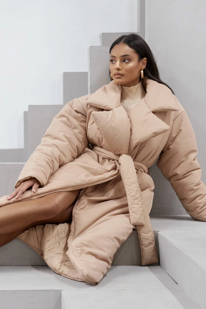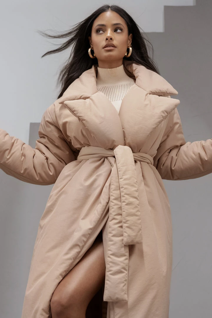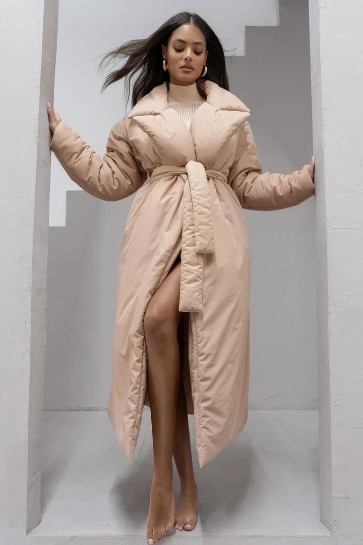 EXCLUSIVELY DESIGNED BY US FOR YOU. We are staying one step ahead of the cold in the TAN LIMITLESS PUFFER JACKET! This longline puffer coat features a notch lapel collar with long sleeves, two side pockets, fitted cuffs, and a removable matching tie belt to hold it all together. Oversized fit. Minimal stretch.
