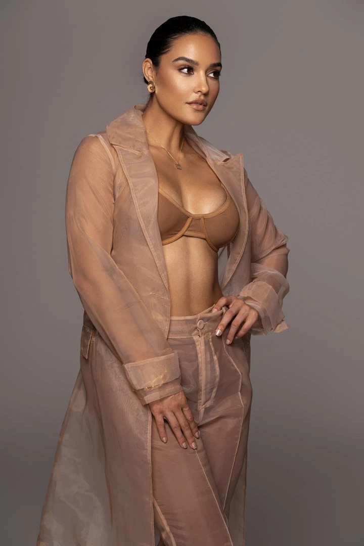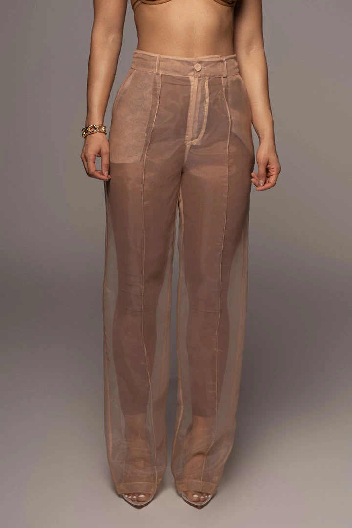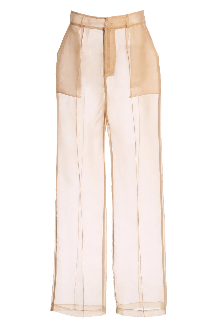 EXCLUSIVELY DESIGNED BY US FOR YOU. Achieve a look that’s iconic in our new TAN LIVY ORGANZA PANTS. Designed in a see through organza fabric, this pair of wide leg trousers come with a front button/zipper closure, two functional side pockets, two back welt pockets, and a vertical line detailing down the center front/back to finish the look. Pair with the JEANNA COAT and JONI BRALETTE for the full look. No stretch.