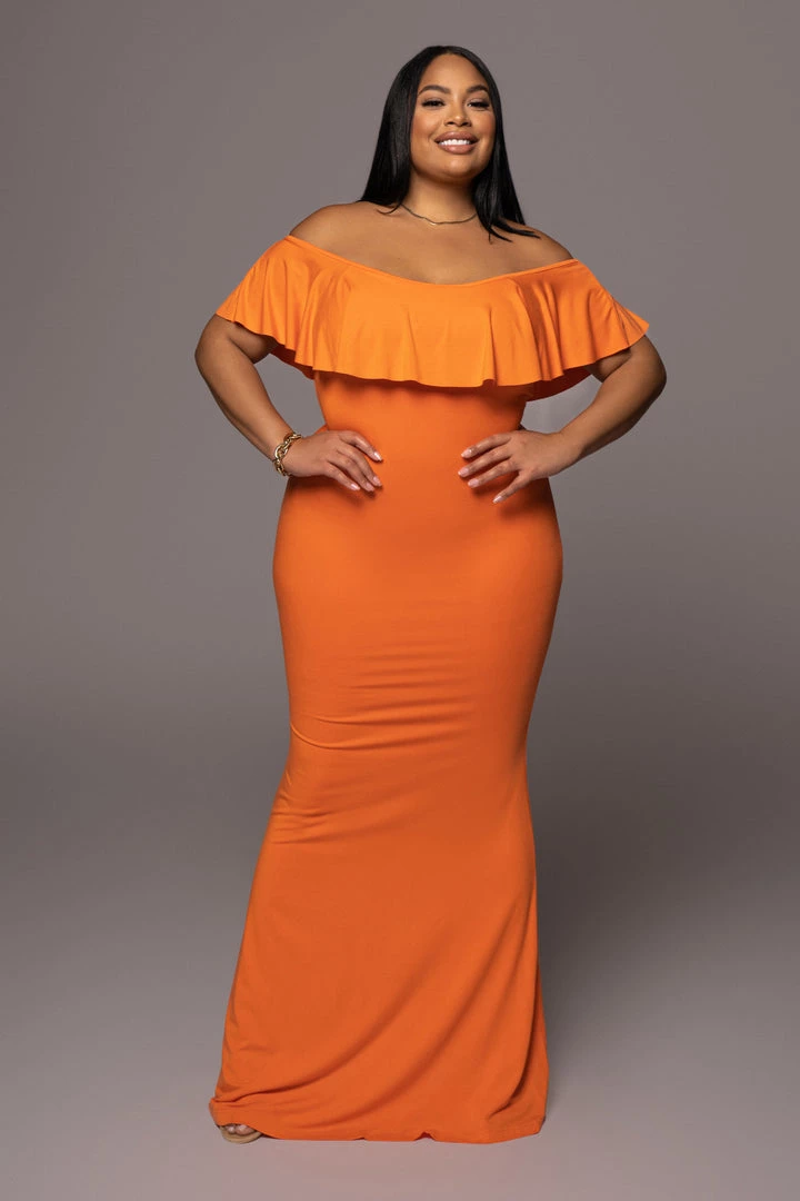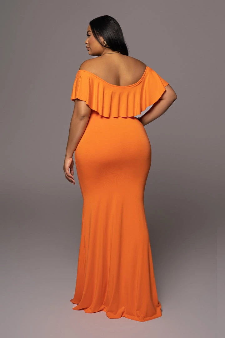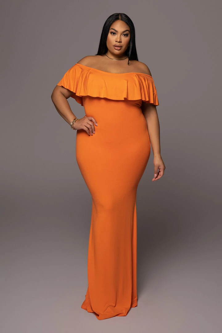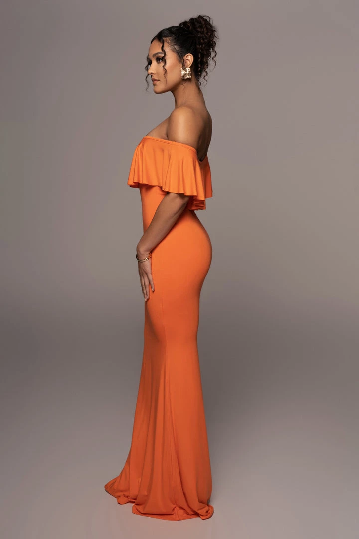 EXCLUSIVELY DESIGNED BY US FOR YOU. Wherever you’re going this spring, bring our TANGERINE ESTELLE MAXI DRESS with you! Crafted in a double lined jersey material, this stunning dress features an off the shoulder neckline with ruffle trim and a relaxed mermaid hem. Timeless, versatile, and perfect for all occasions! Elastic top hem. Stretchy.