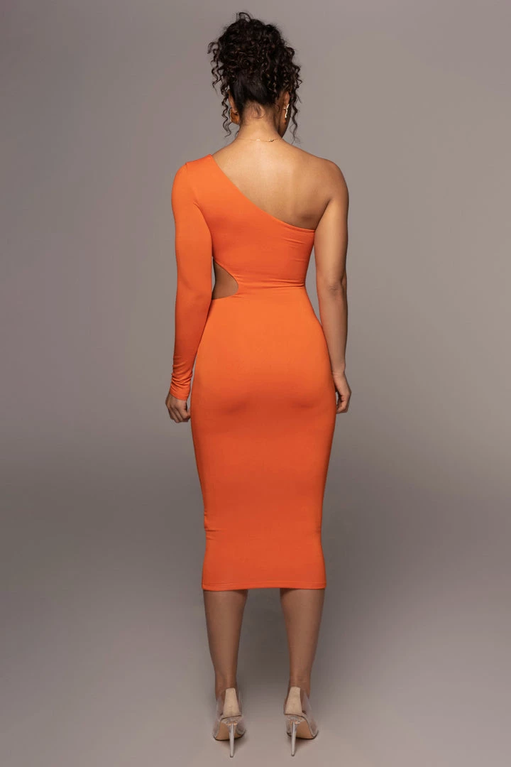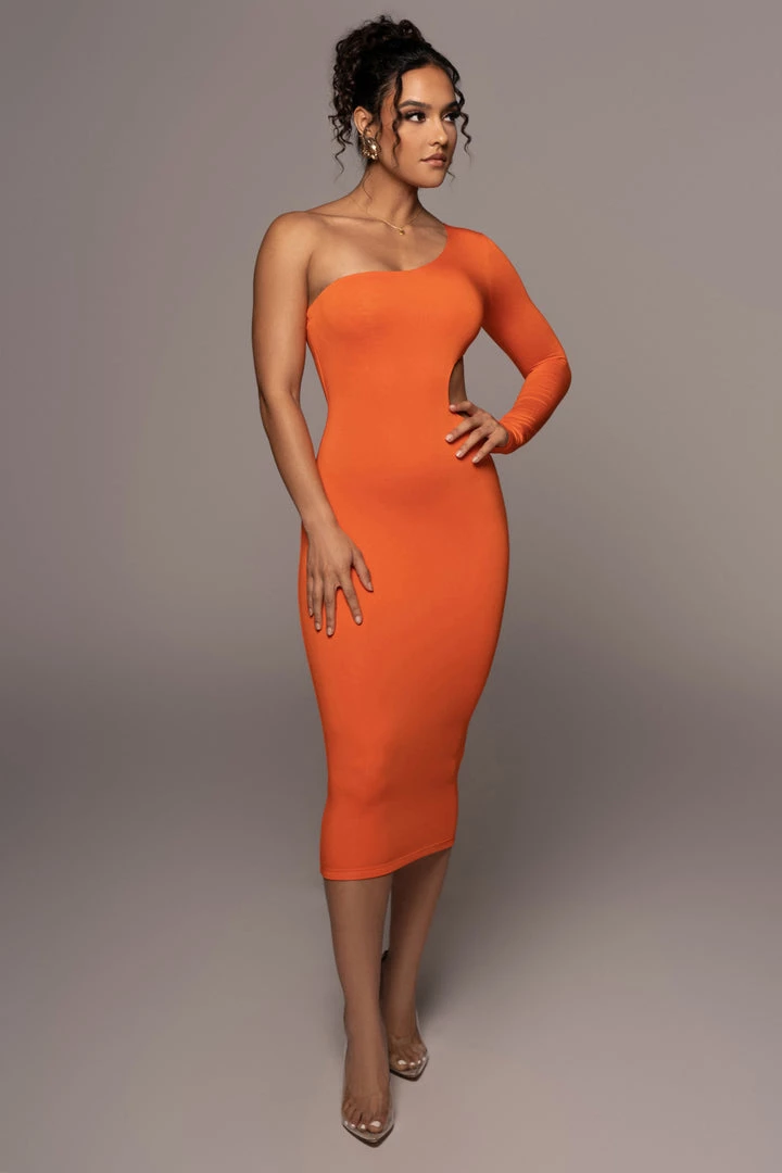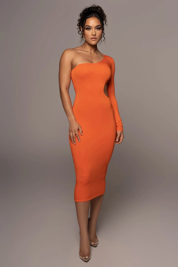 EXCLUSIVELY DESIGNED BY US FOR YOU. You’ve never met another like our TANGERINE JULIA MIDI DRESS! Crafted in a double lined jersey fabric, this stylish bodycon dress is perfect for a night out on the town! Featuring a low scoop neck with one sleeve neckline and an alluring side cutout at the waist. Stretchy. Midi hem.