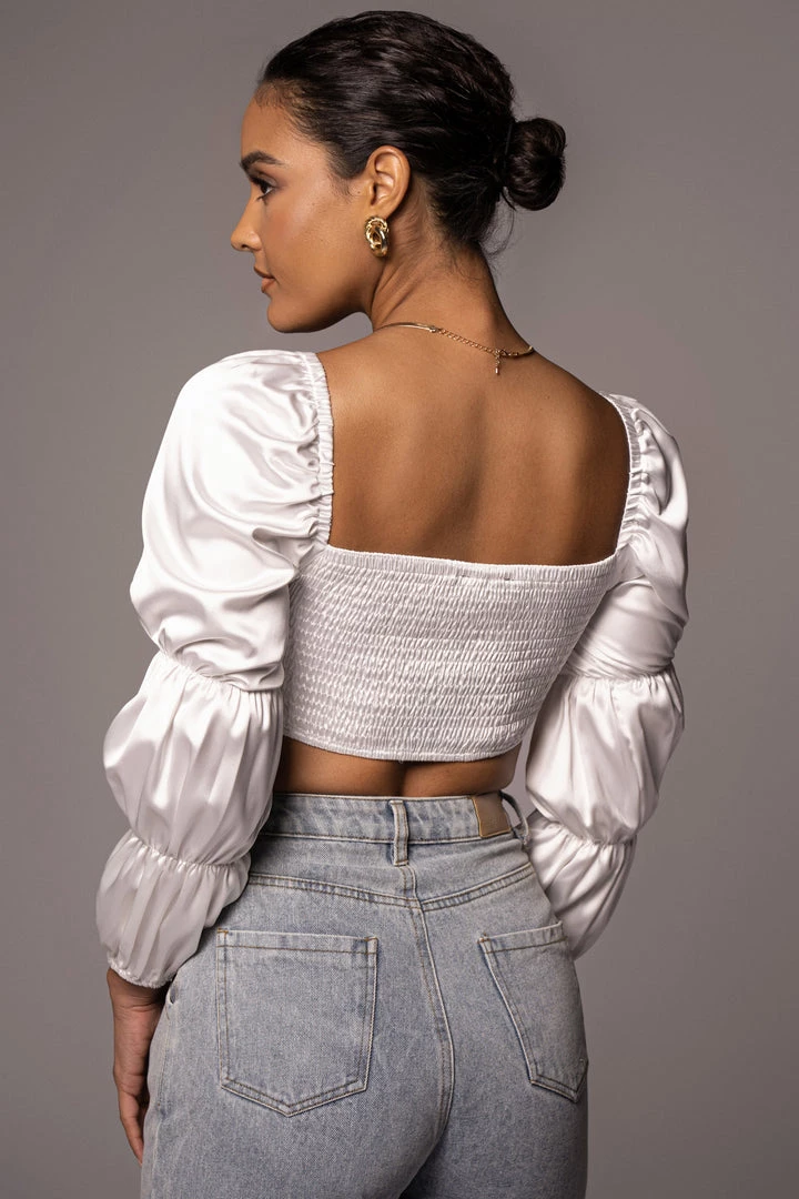 Keep the mood effortlessly elegant in this beautiful long sleeve crop top that fits perfectly into your outfit plans! Crafted in a satin fabric, our WHITE BOLERO SATIN CROP TOP features an elastic top hem with a sweetheart neckline and long bubble sleeves. Designed with two strings that tie around the front waist for a stylish cutout look! Smocked back for extra stretch.