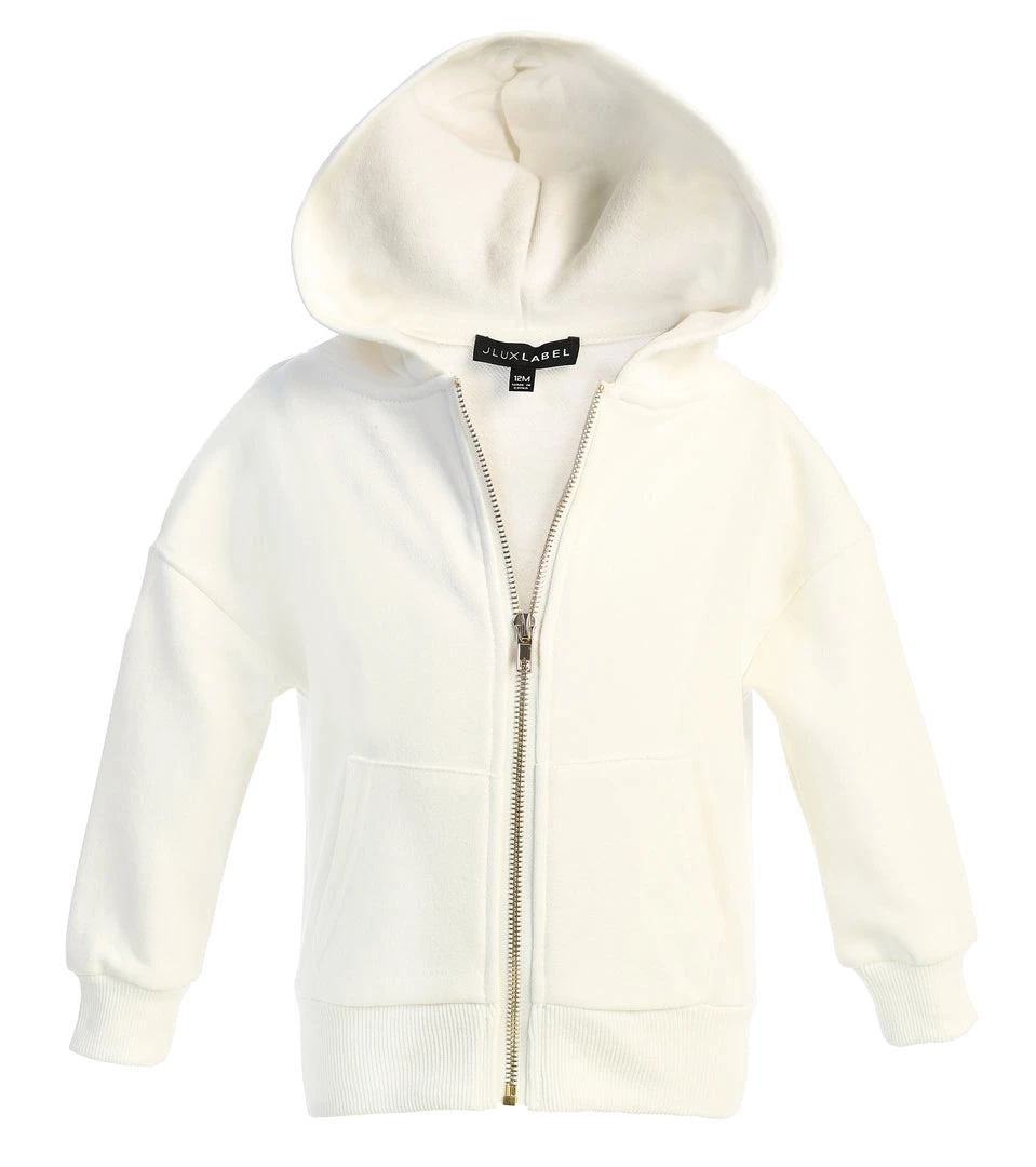 EXCLUSIVELY DESIGNED BY US FOR YOU. Have the little ones matched to perfection in our limited edition WHITE JLUXKIDS FLEECE UNISEX HOODIE! This miniature zip-up sweatshirt is the only clothing your child will want to live in this season! Cut in a stylish oversized fit, featuring a hooded neck with drawstrings, front zip-up closure, a split kangaroo pocket, and ribbed bands at the cuffs and hem. Pair with our JLUXKIDS UNISEX CARGO JOGGERS for a look that complements your child’s style! Stretchy. Gold tone hardware.