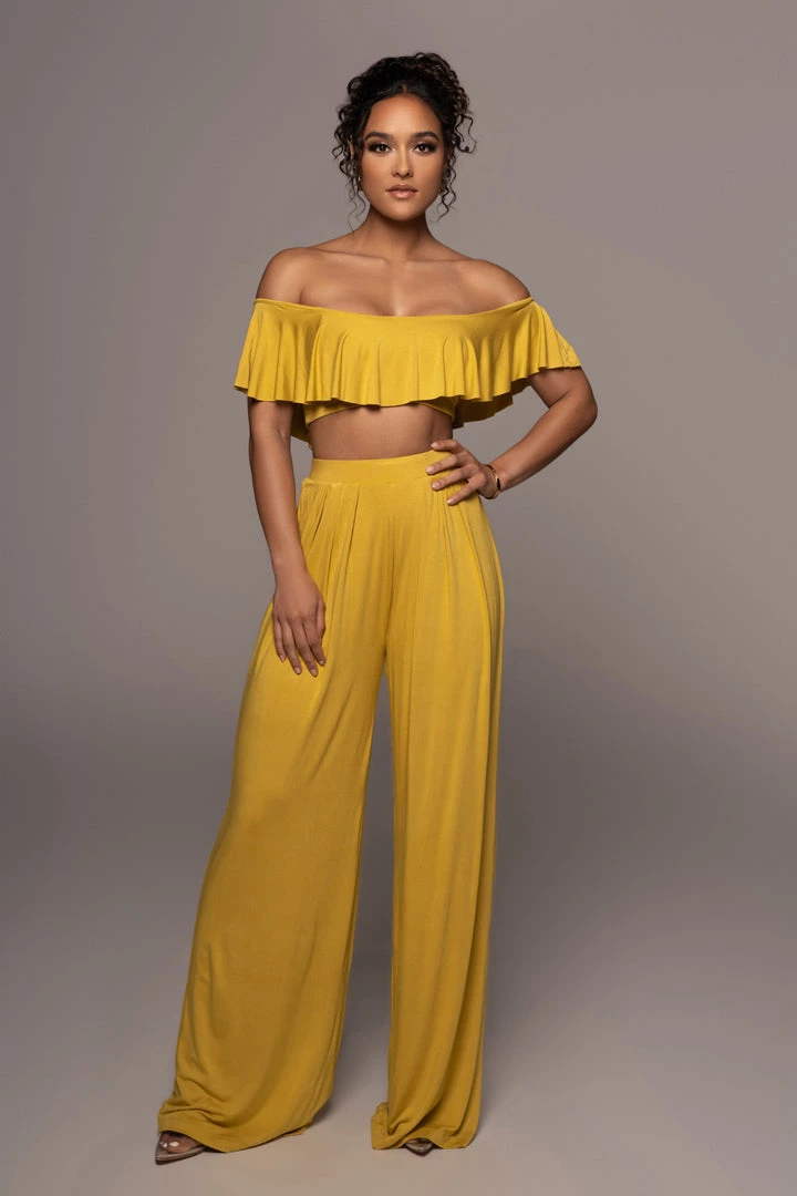 EXCLUSIVELY DESIGNED BY US FOR YOU. Add a touch of flare to your look with the YELLOW CLOSE TO YOU SET! Crafted in double lined jersey material, this two piece set features a cute crop top with an off the shoulder neckline and trendy ruffle trim. The pant bottoms of the set are topped with an elastic waistband and fall down to classy wide leg hems. Stretchy. Sold as set.