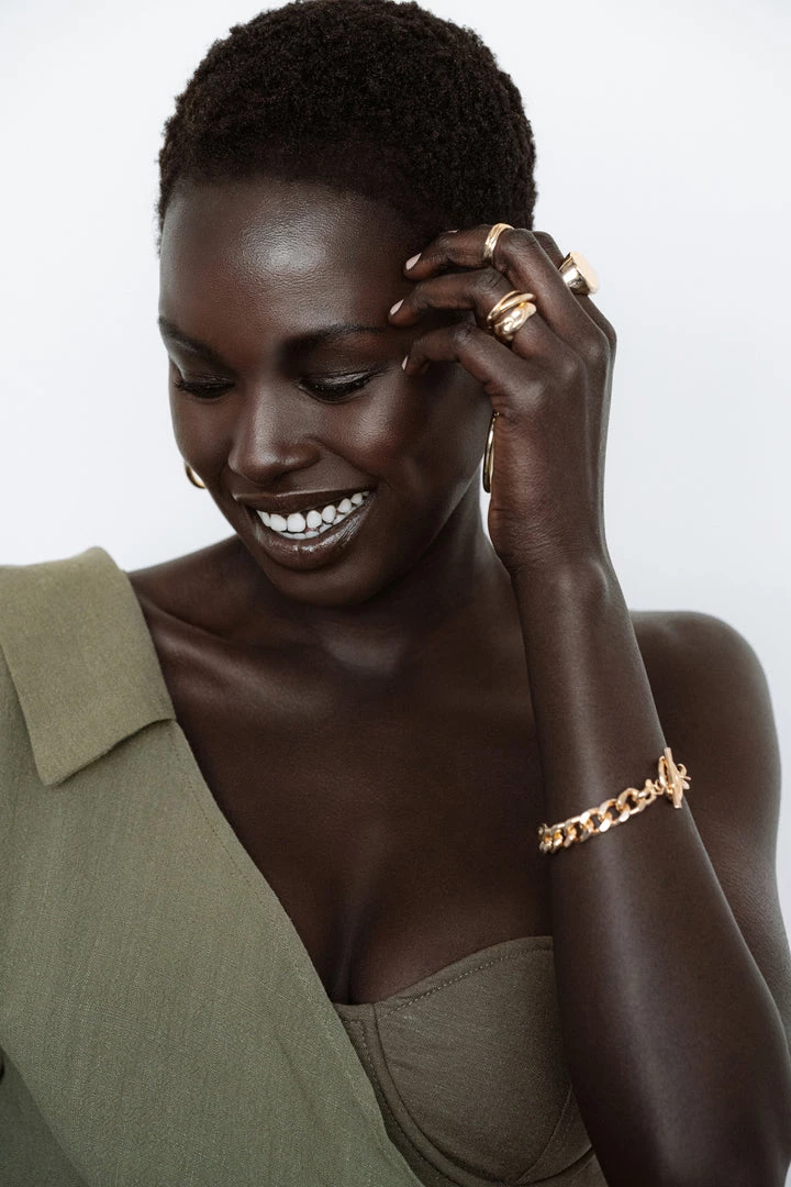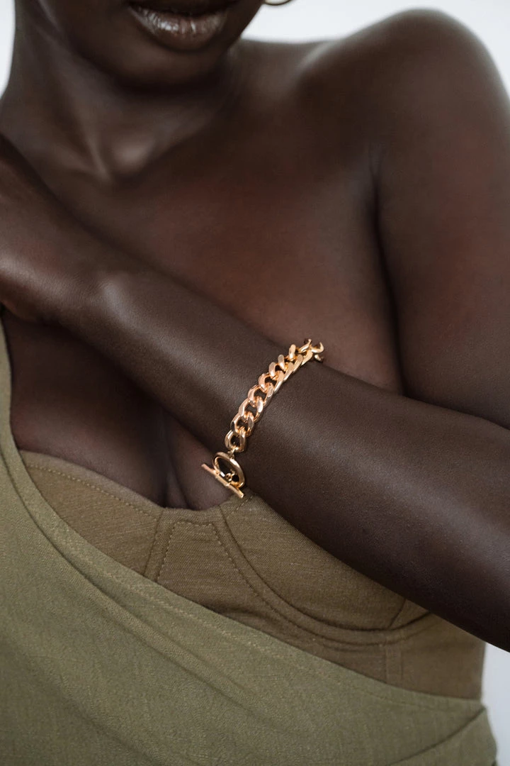 Make a stylish entrance with the GOLD JAX CHAIN BRACELET. This high shine chain link bracelet is featured in a gleaming gold tone finish and comes with a toggle closure for easy wear.